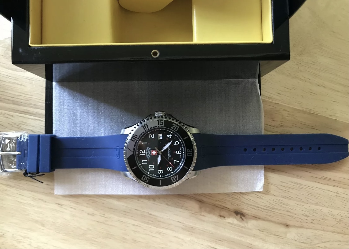 Ремешок: синий фирменный силикон с фирменной баклей, очень мягкий и комфортный. Возможность поставить любой ремень на 24 мм - самый ходовой размер.