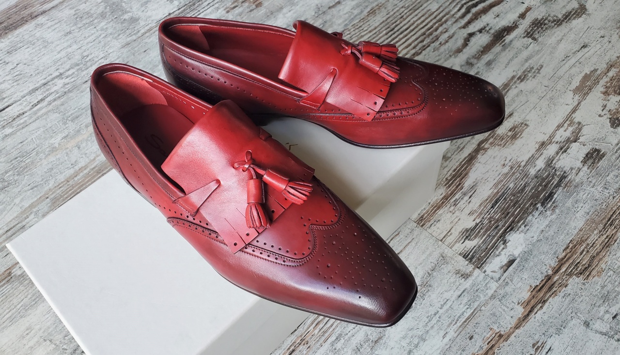 Изготовлены из 100% телячьей кожи высочайшего качества выделки, имеющей градиентную комбинированную окраску в "тёмно-красный" цвет с эффектом патинирования "антик", выполненную вручную.