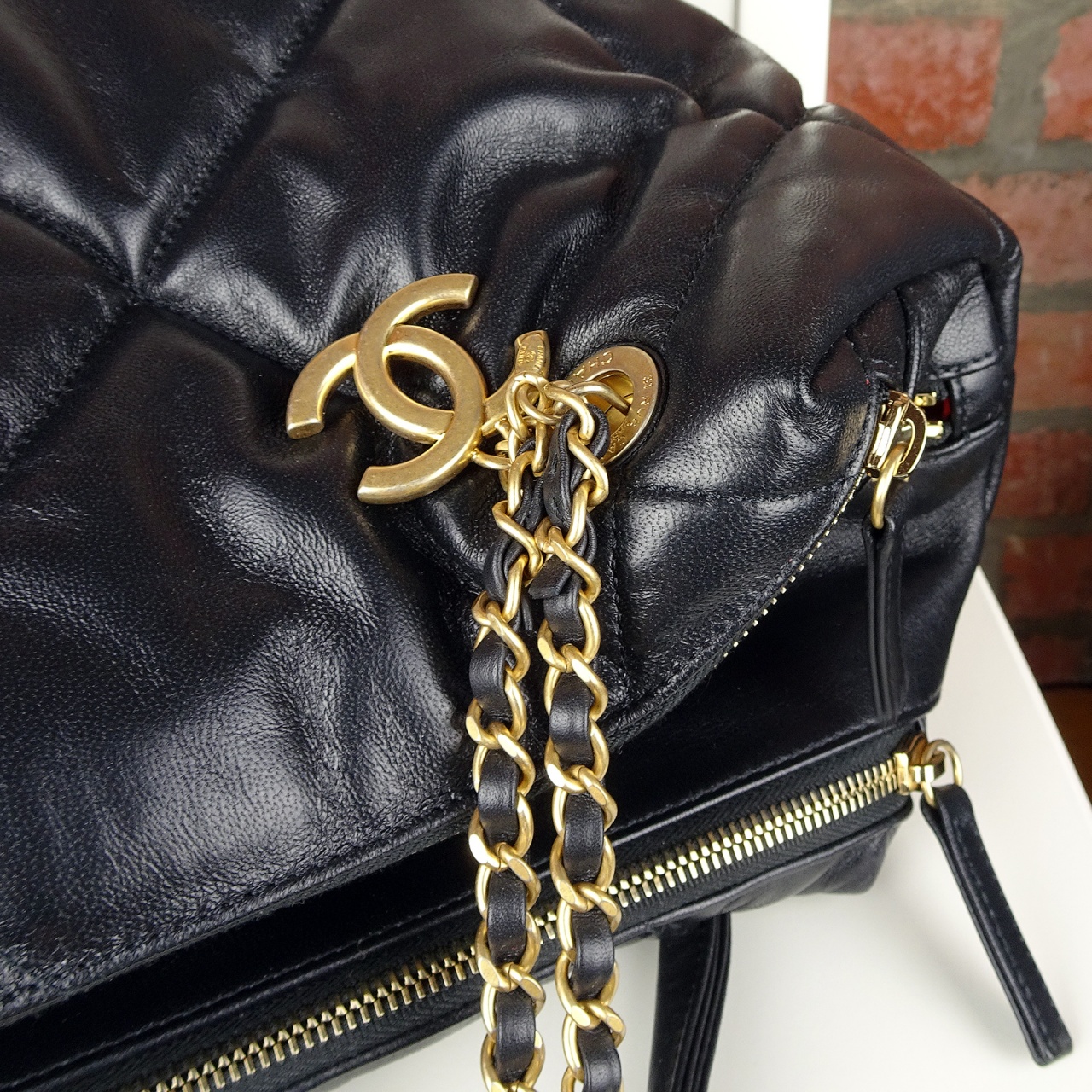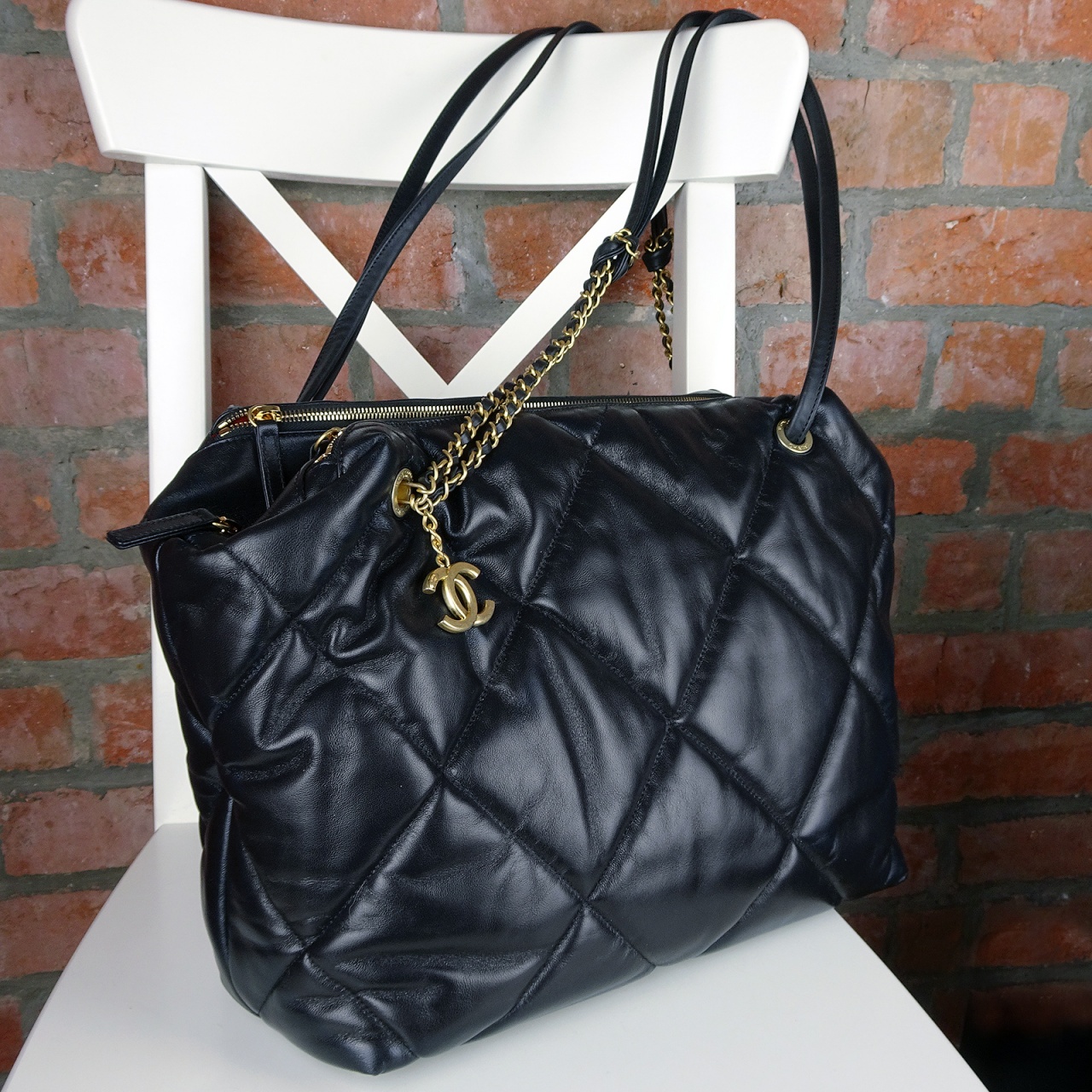 Во-первых, новейший стиль сумок Chanel - "гигантский ромб"! Сумка простегана знаменитым ромбом Matelassé, но, весьма увеличенного размера. Этот дизайнерский прием - самая новинка сезона, для тех кто следит за коллекциями Chanel и отмечает все их новые тренды.