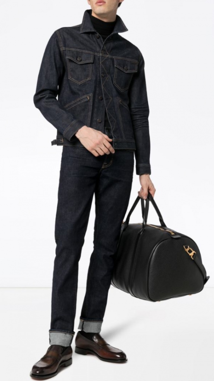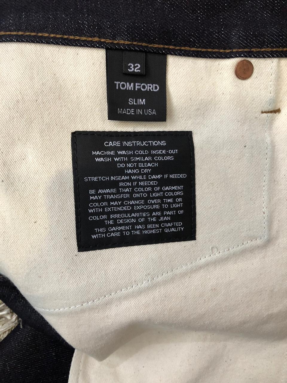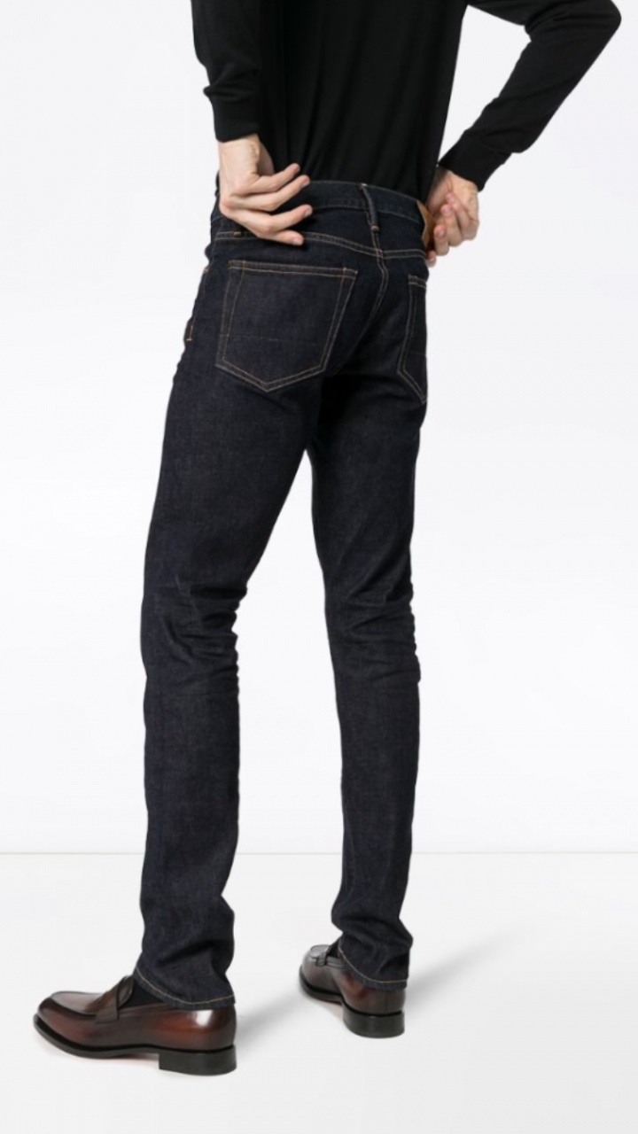 Для пошива джинсов Tom Ford выбрал особо прочный деним селвидж.Его изготавливают на старинных станках челночного типа,который может ткать только очень узкую полоску ткани(так,кромку не срезают и не обрабатывают оверлоком).