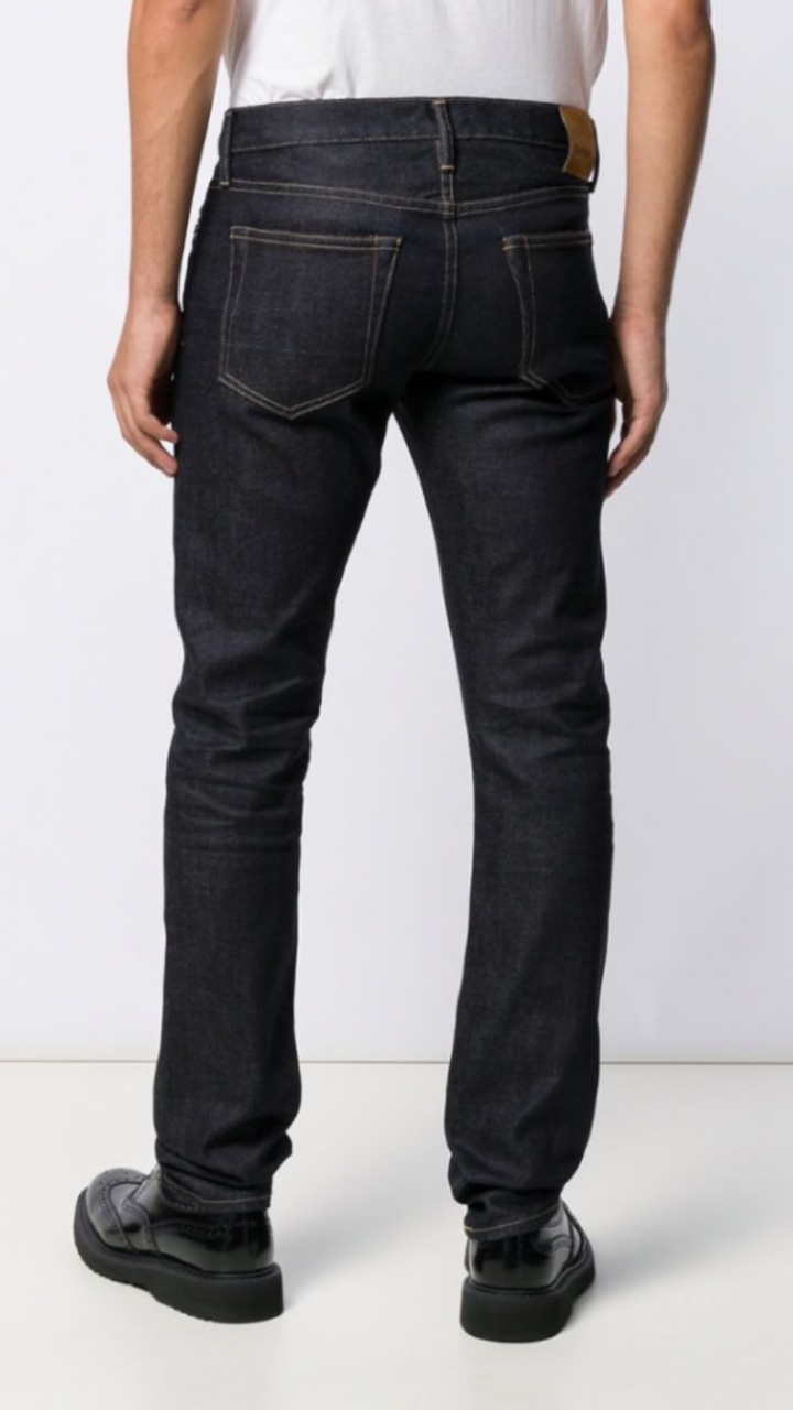 В продаже новые мужские джинсы от люксовой американской марки TOM FORD.Классическая пятикарманная модель тёмно-синего цвета,зауженного кроя Slim,имеет контрастную прострочку жёлтого цвета,потайную застёжку спереди на брендированные пуговицы-клёпки серебристого цвета.Сзади на поясе традиционный ярлык с логотипом марки,выполненный из тёмно-жёлтой замши.