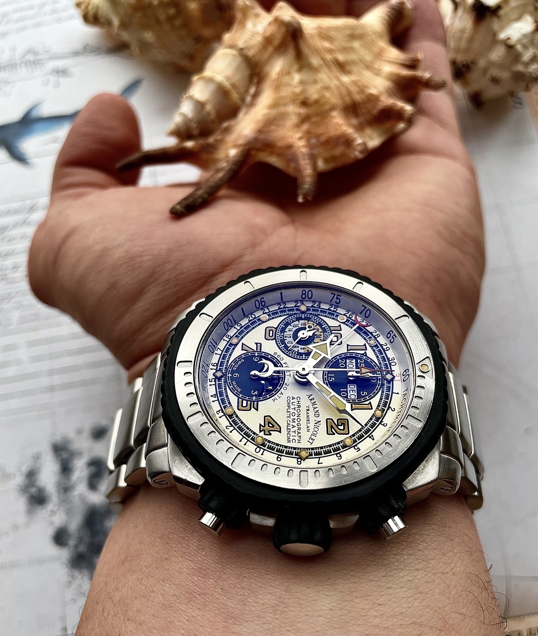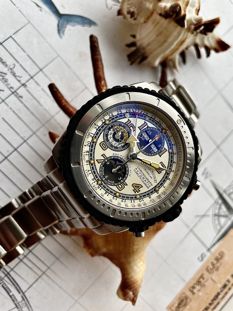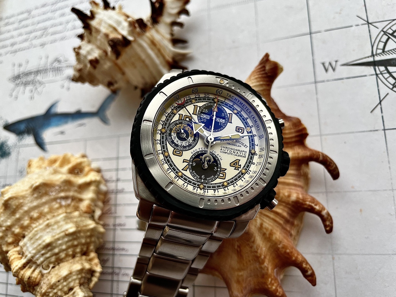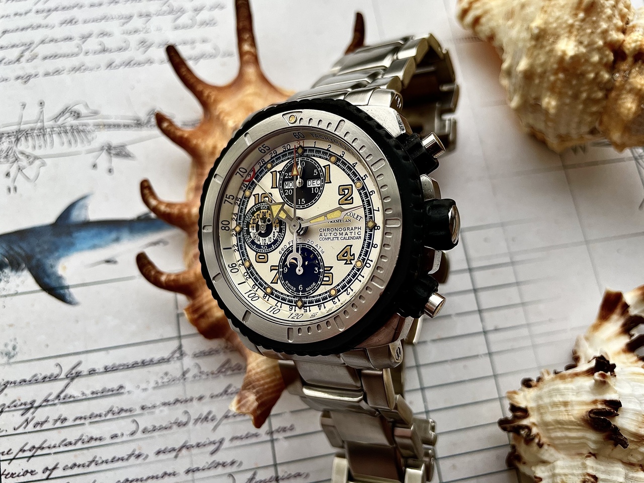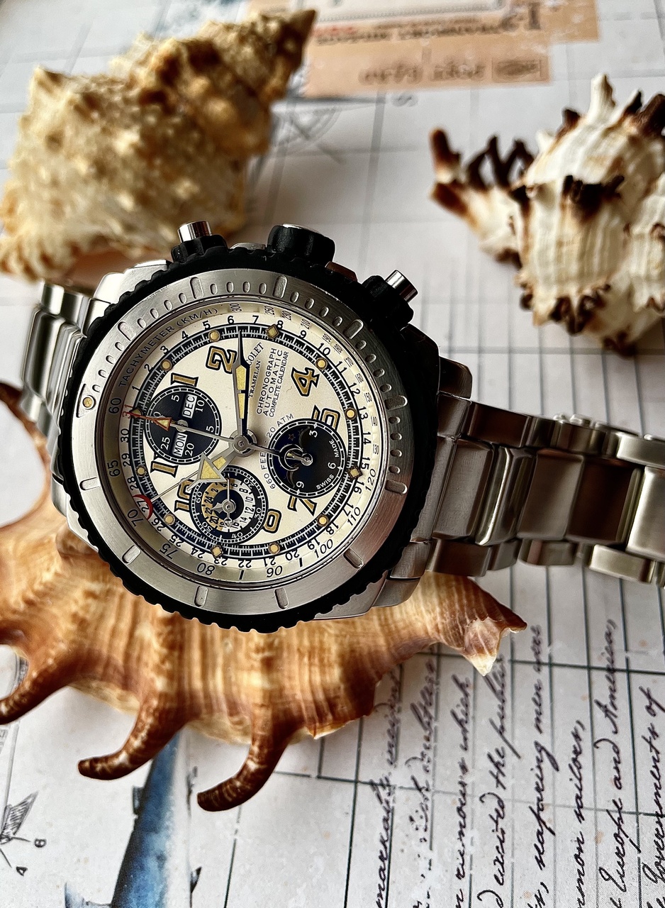 Функционал просто космос. Тут и хронограф, и лунник, и 24 часовой повторитель времени, и дата в виде ретроградной стрелки, и день недели, и даже месяц!!!