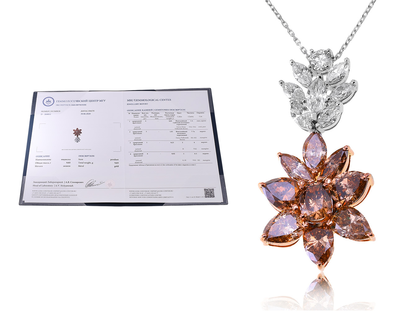 Представляем вашему вниманию потрясающую золотую подвеску с бриллиантами 7.03ct. Сертификат МГУ.