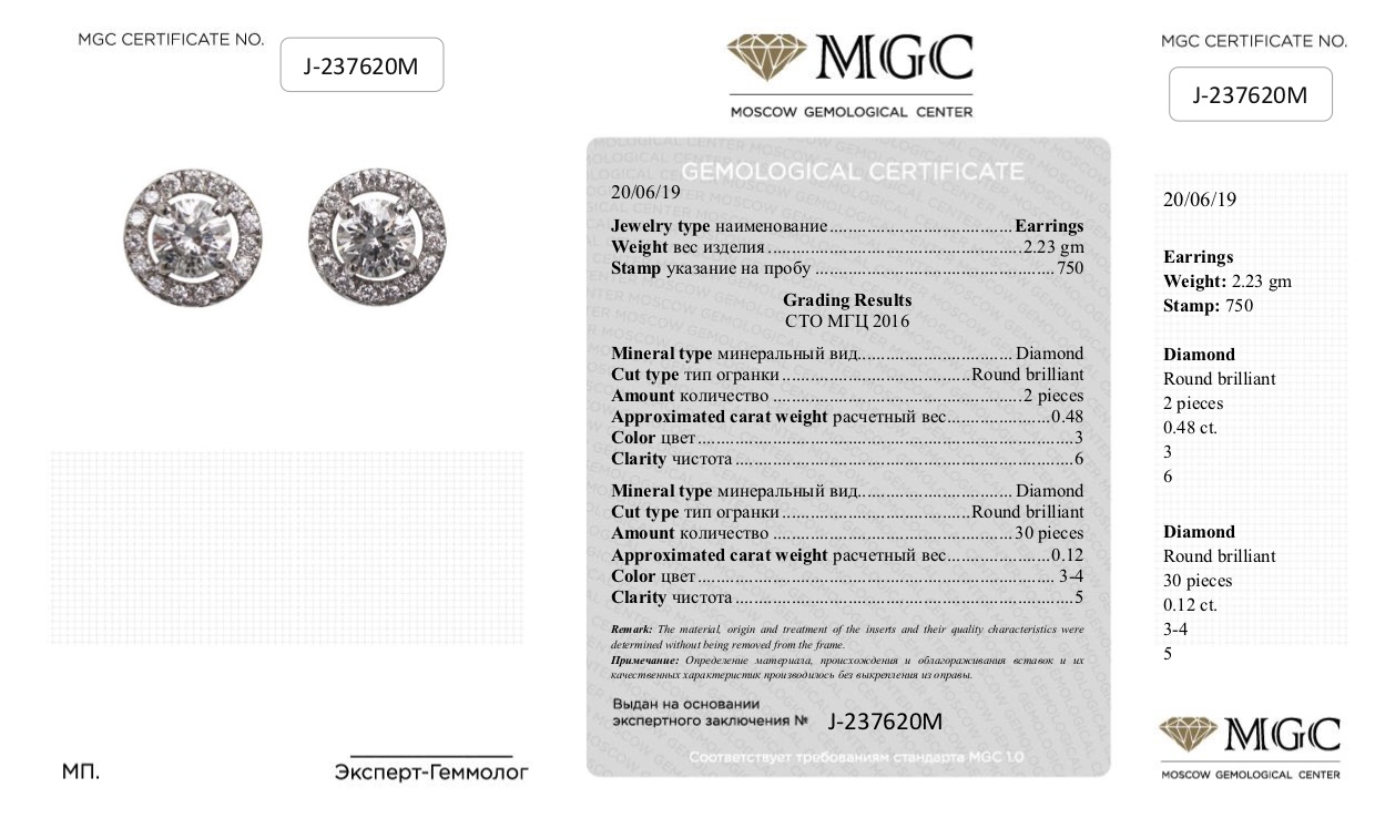 Серьги-пуссеты из белого золота с бриллиантами 0,6 карат (сертификат МГЦ)