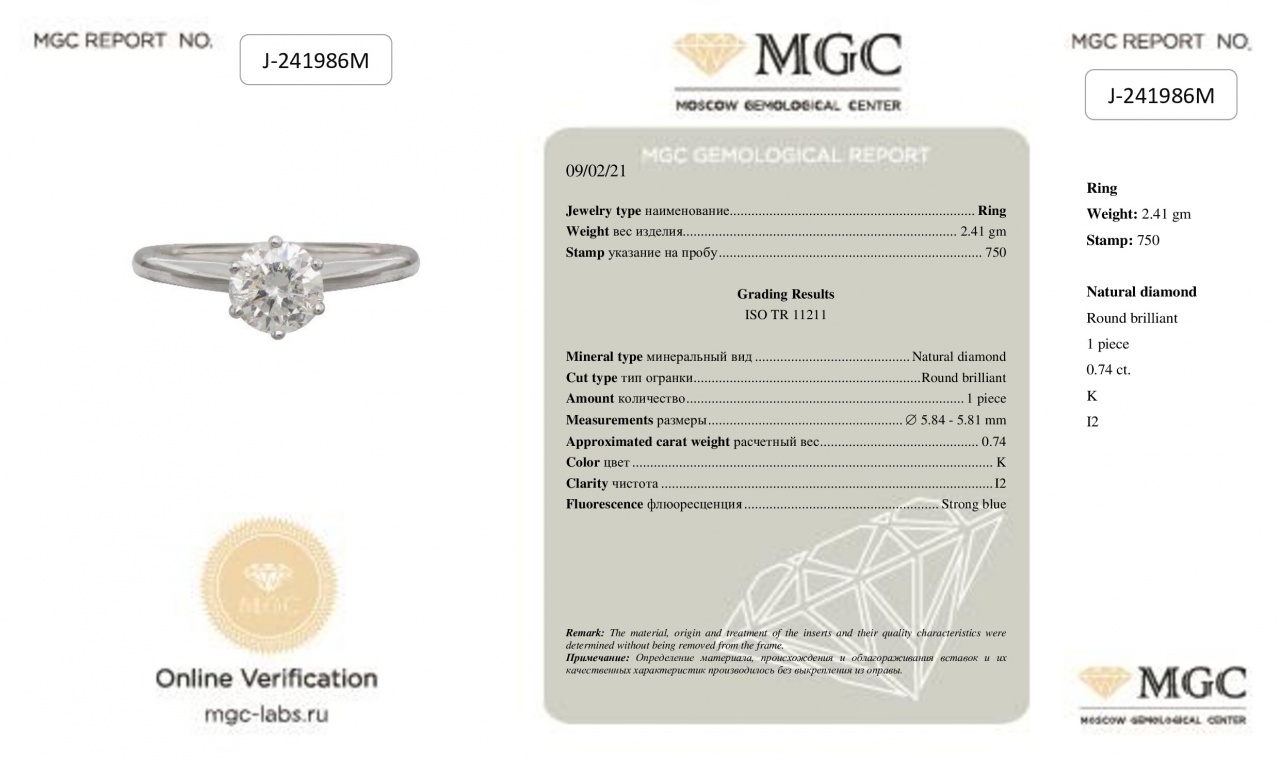 Кольцо из белого золота с бриллиантом 0,74 карат (сертификат МГЦ)