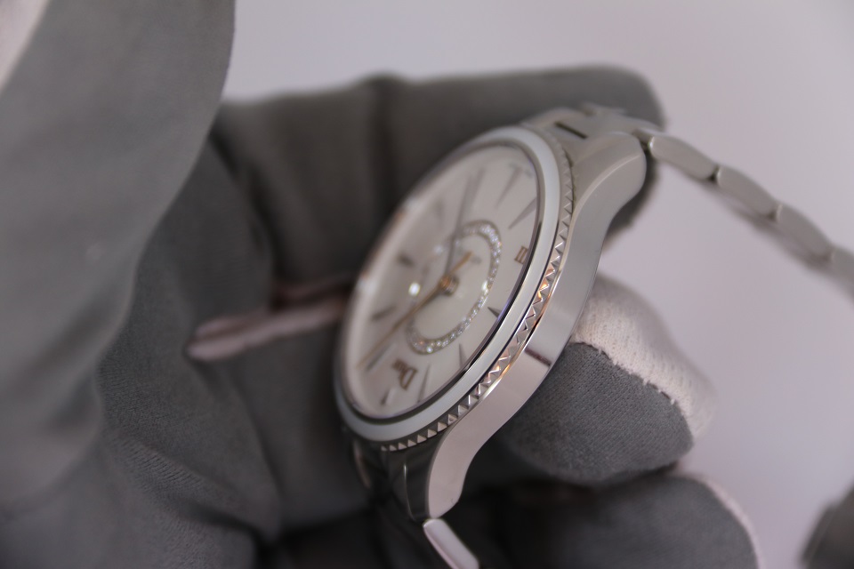 Перламутровый безель. Перламутровый циферблат украшен 36 бриллиантами.