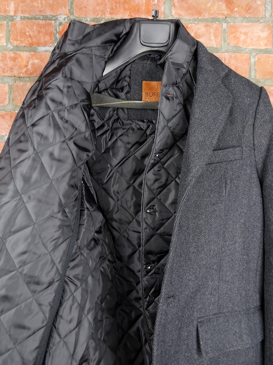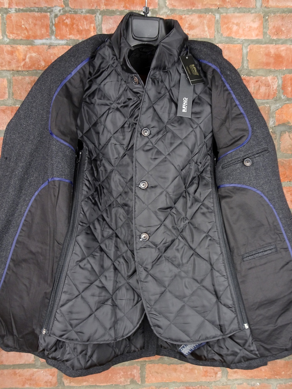 Цвет - серый с рисунком в "елочку" (herringbone). Цвет съемной подстежки черный. Коричневые патчи на локтях.