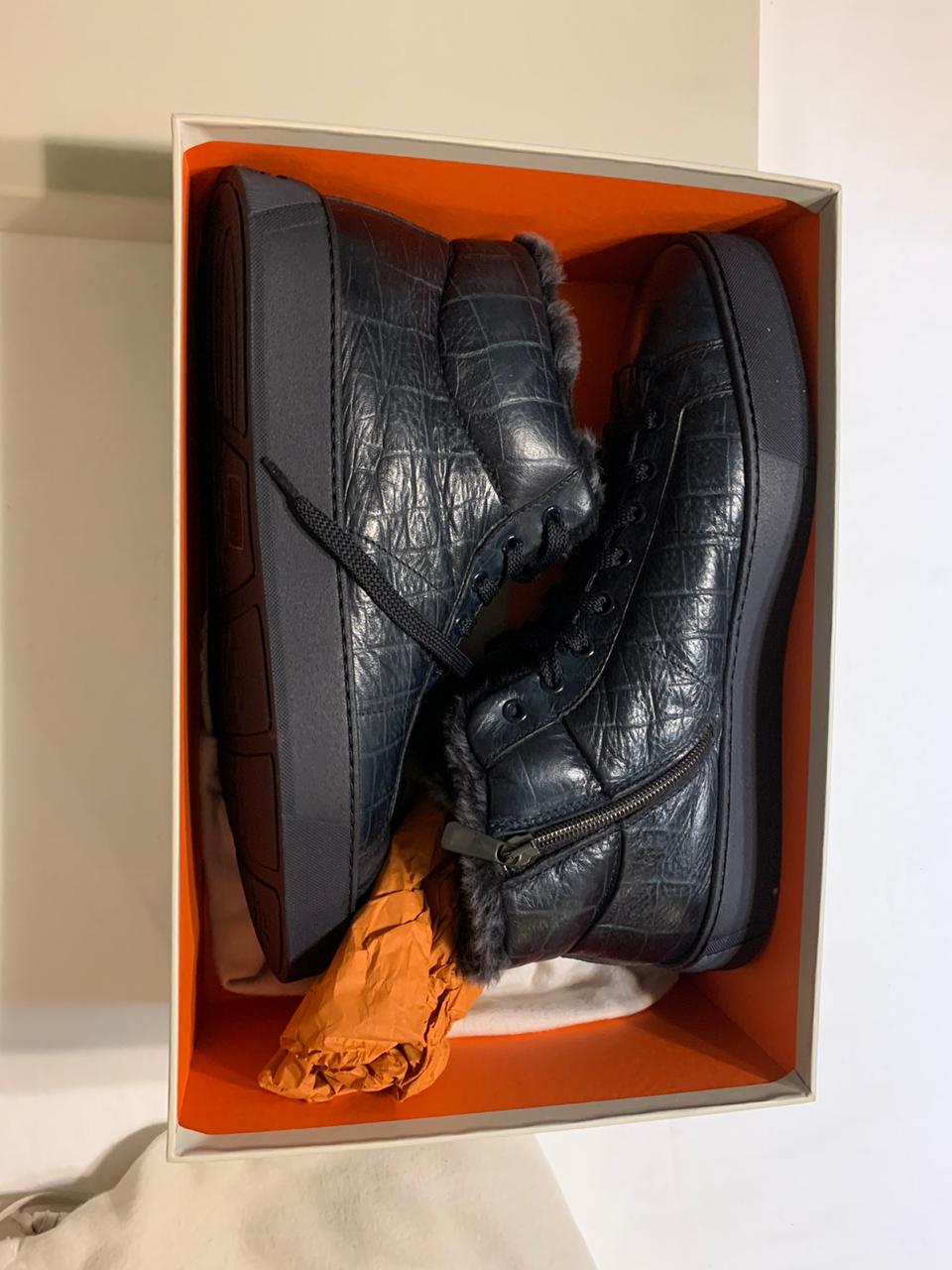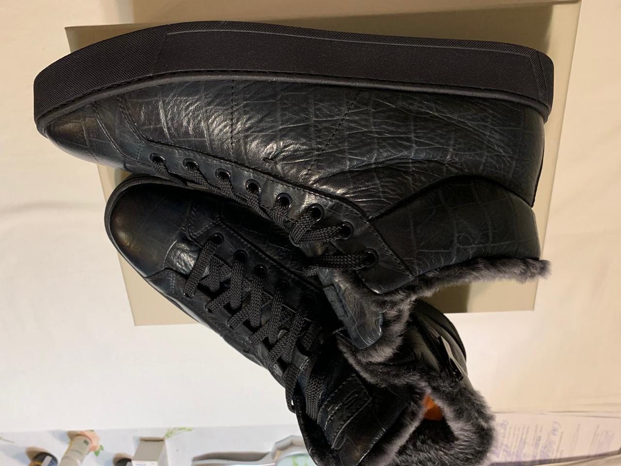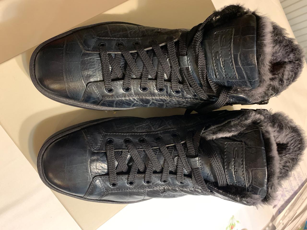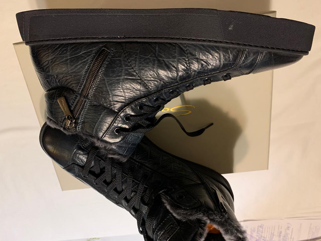 Продаются новые мужские кроссовки на меху бренда SANTONI превосходного исполнения, темно изумрудного цвета , высококачественная кожа с принтом, скругленный мысок, молния сбоку, внутри 100% натуральный мех, подошва резина с тиснением , запасные шнурки, в комплект входит пыльник, гарантированный 100% оригинал, размер 43, производство Италия.