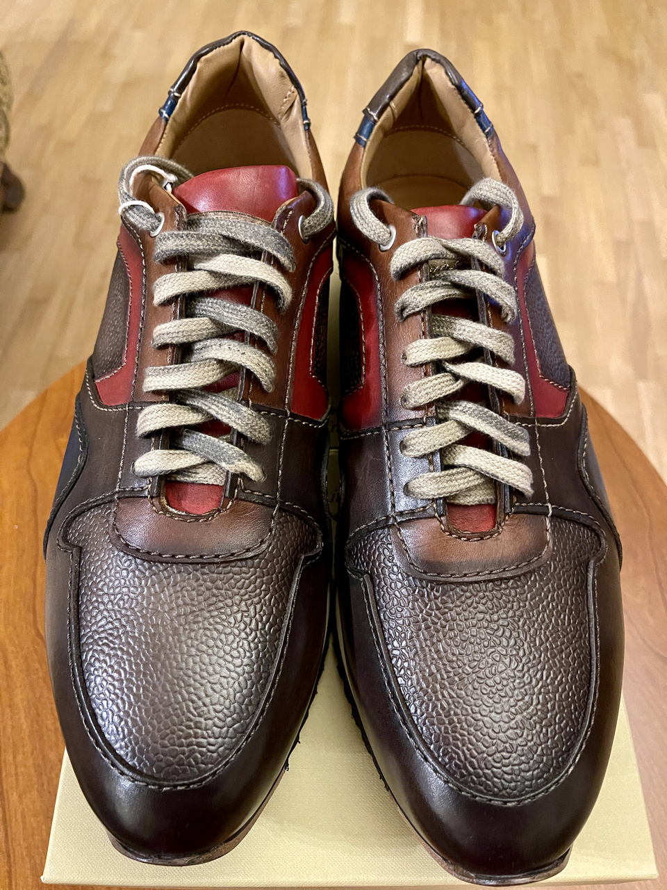 Реализованная вручную с особой тщательностью и большим вниманием к деталям, обувь изготавливается из кожи, обработанной старинным и традиционным способом дубления в воде, покрашенной натуральным воском, сшитой веревками из натурального шпагата и полированной водой.