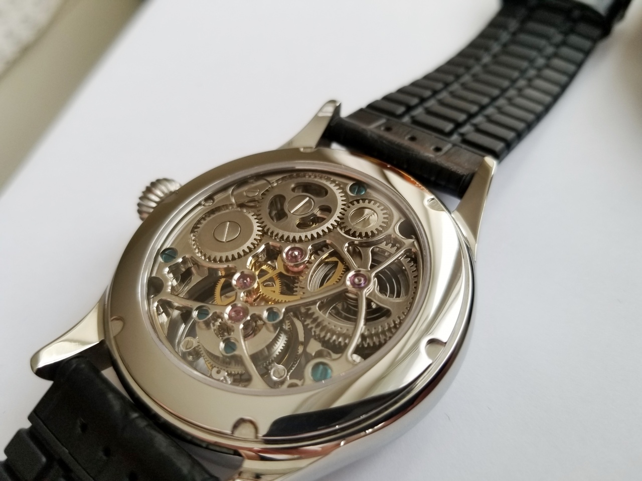 Точность хода: Первый класс, по факту 20 секунд в сутки. (завод изготовитель дает допуск +/-25 секунд в сутки). За счет калибровки и наличия турбийона возможно добиться нулевой погрешности хода в сутки.