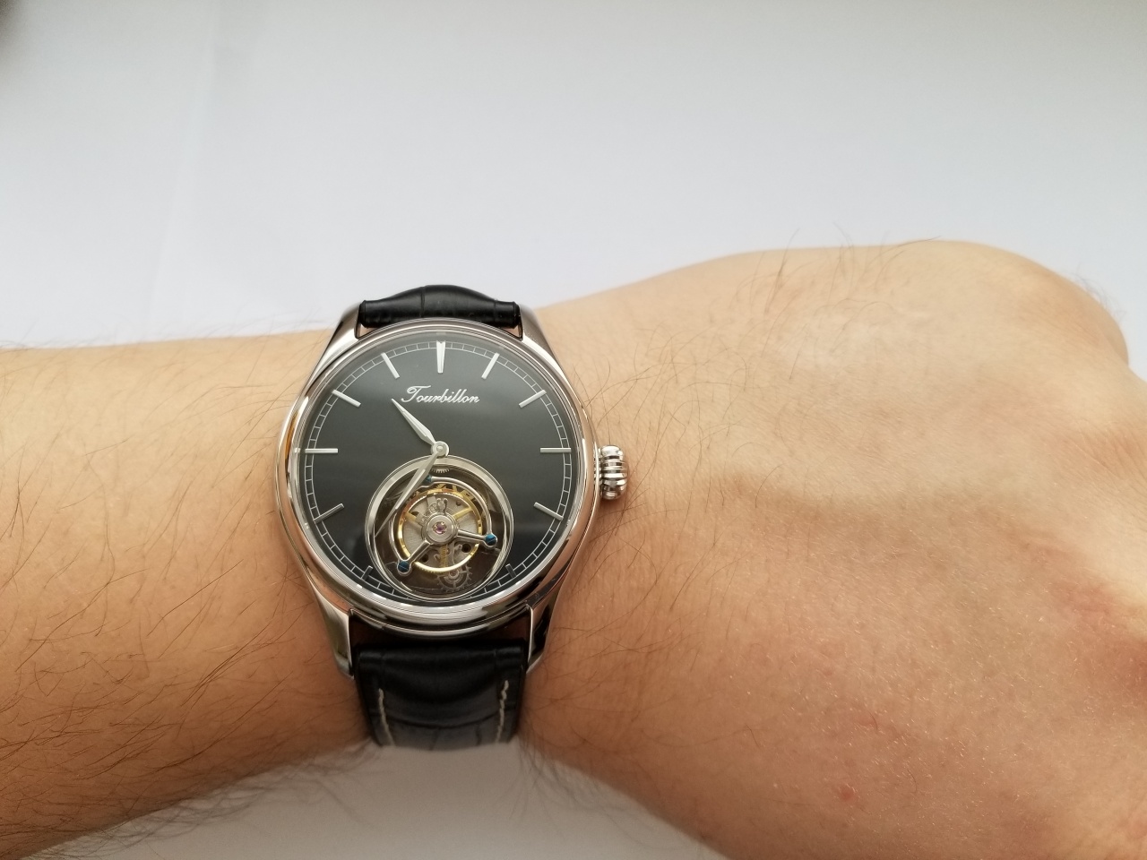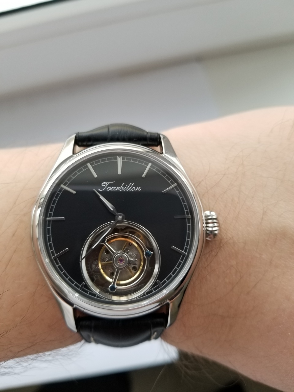 Обалденные костюмные часы, однозначно будут привлекать взгляды окружающих и производить впечатление. Очень красивый механизм, турбийон встречается крайне не часто, особенно учитывая что стоимость самых доступных швейцарских часов с турбийоном стартует от 11 тысяч евро. Здесь вы получаете