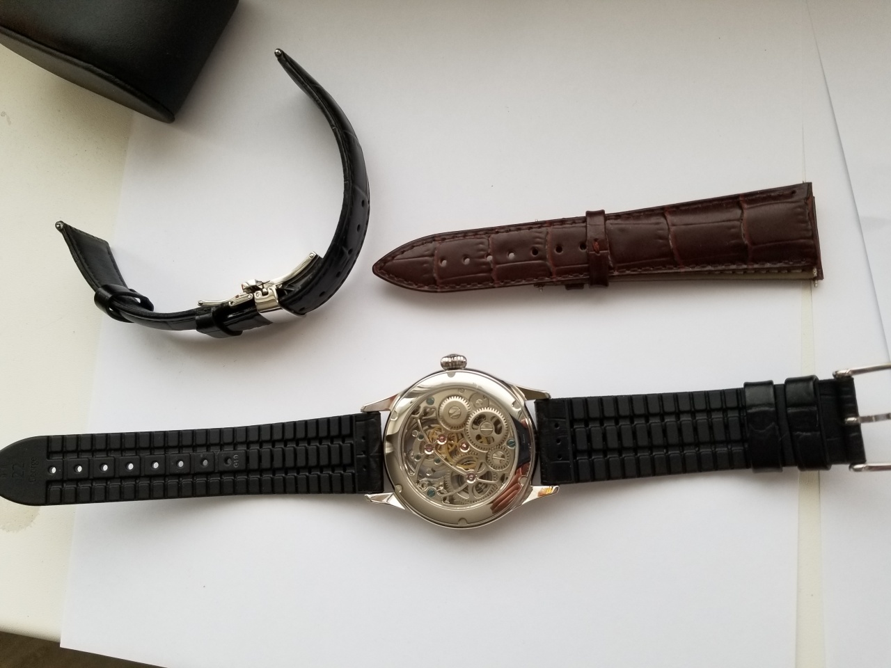Часы, ремешки все абсолютно новое. Полный комплект: 2 коробки, гарантийные и прочие документы, 2 базовых кожанных ремешка (черный и коричневый) с застежкой бабочка + дополнительно фирменный ремешок HIRSCH George L 09251280-50-2-24.
