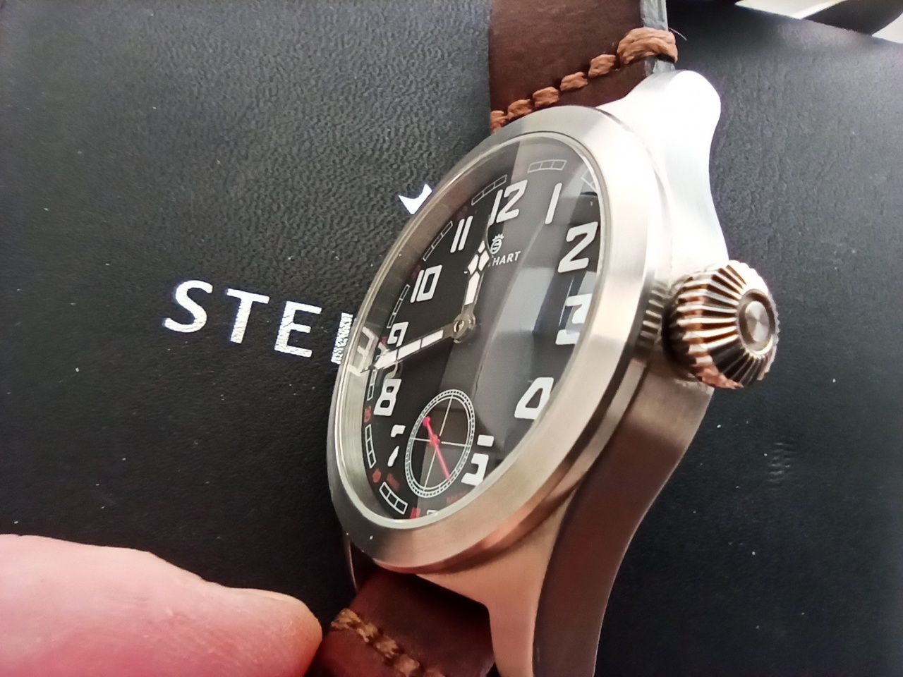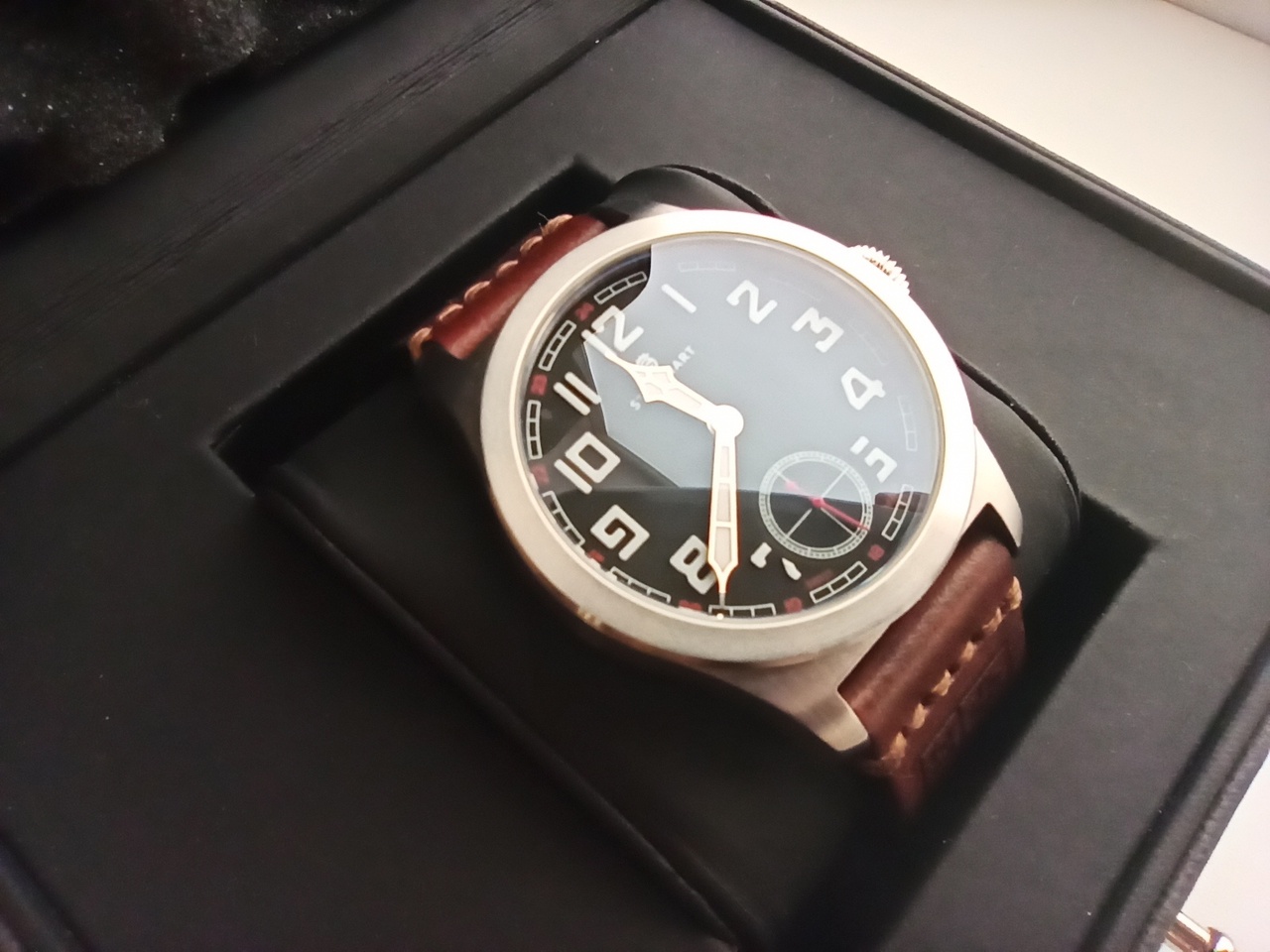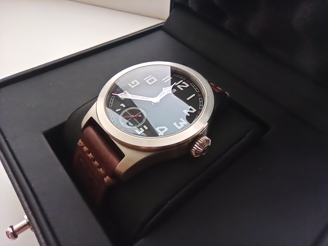 Корпус часов изготовлен из сатинированной нержавеющей стали, на задней поверхности расположено ещё одно сапфировое стекло. Оно позволяет иметь хороший обзор богато украшенного калибра ручного завода ETA Unitas 6498, чрезвычайно надежный механизм движение, который отлично выполнял свои обязанности в швейцарских карманных часах уже десятилетия назад.