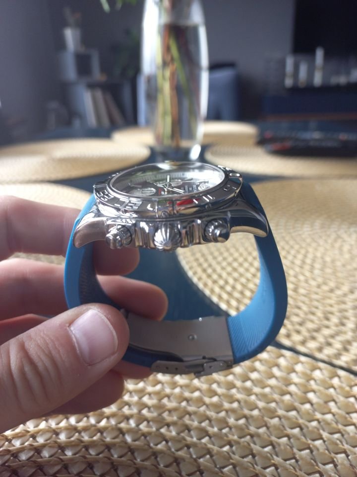 В продаже Breitling Chronomat B01, 44 мм., Ref. AB0110. Часы находятся в Москве. Состояние хорошее. Второй хозяин, покупал тут на форуме. Синий ремень НЕоригинальный. Оригинальный кожаный ремень в комплекте. Торга нет. Только личная встреча, никаких пересылов. К проверкам готов. По обмену - предлагайте только золотые часы. Возможна доплата.