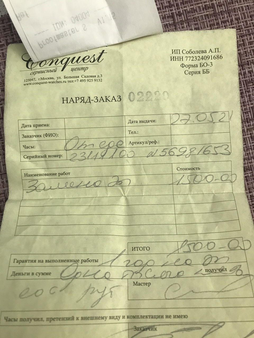 27.05.2021 была произведена замена батарейки у авторизованного дилера, с проверкой герметичности. По результатам тестов часы показали себя с лучшей стороны. Фото Карты с результатами теста на герметичность и чеком о замене батарейки прилагаю.
