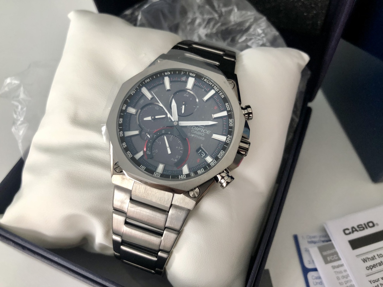 Кварцевые наручные часы на солнечной батарее Casio EQB-1100DC-1A коллекции Edifice с модулем Bluetooth Smart. Тонкий корпус — 8.9 мм. Калибр механизма — 5639. С помощью технологии Bluetooth Smart данная модель имеет возможность поддерживать связь с системами IOS и Android. Возможности Bluetooth в данной модели: С помощью специального приложения Edifice Connected возможно установить время в конкретном городе (300 городов), время будильника, воспользоваться секундомером и просмотреть результаты показаний секундомера, установить точное текущее время, а также в случае потери смартфона возможно воспроизвести на нём сигнал. Функциональность данной модели: режим сохранения энергии; функция информирования о недостаточном заряде аккумулятора; индикация даты, дня недели и времени суток (24-х часовая шкала); ежедневная автоматическая корректировка точного времени по Bluetooth; вечный календарь; будильник; двойное время; секундомер с точностью 1/1000 секунды, измерением до 23 часов 59 минут 59 cек. и записью результатов (до 200 кругов); функция "Авиарежим". Стрелки и метки покрыты люминесцентным напылением (светятся в темноте). На корпус и браслет нанесено стойкое PVD покрыти. Водонепроницаемость WR100 (10 атм).