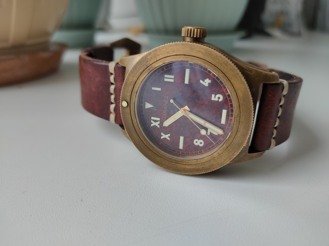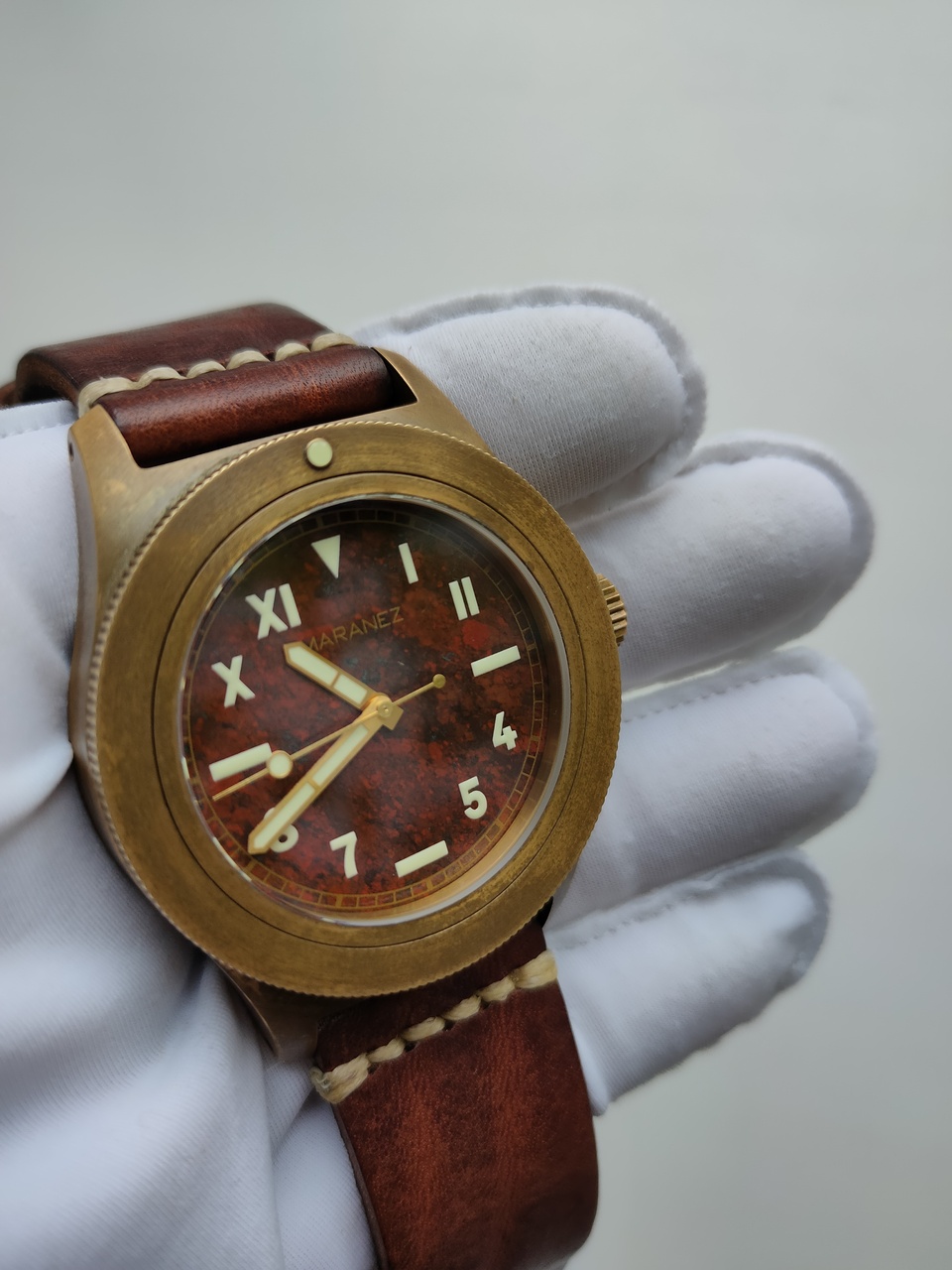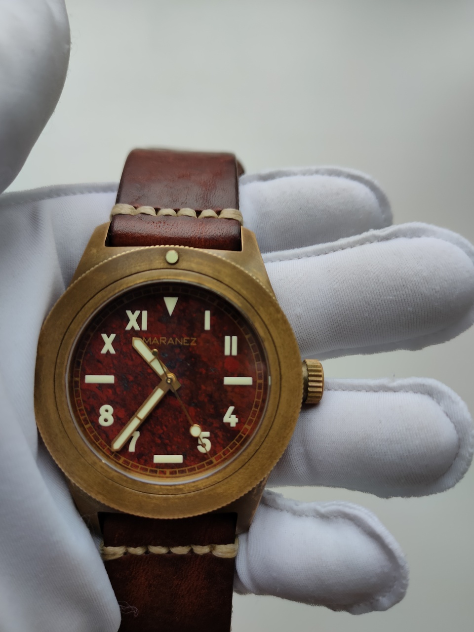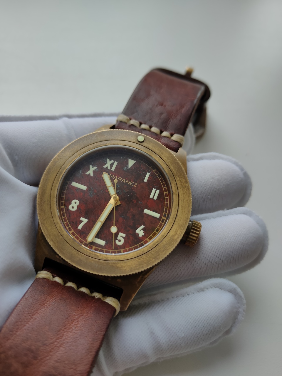 Предлагаю к продаже классный латунный Maranez. Продажа в связи с оптимизацией сета. Такие уже не выпускают. Шикарный цифер калифория из камня яшмы. Отличный сочный люм! Состояние "А" поставил с запасом. Под капотом надежный и проверенный временем NH35 от Seiko. Ход уверенный. Ремешок толстый качественный из итальянской кожи с крупной фирменной баклей с гравировкой аквалангиста. В комплекте кожаный чехол для переноски, инструмент для смены ремешков и НОВЫЙ оригинальный ремешок с крупной баклей. Цифер на солнце смотрится бомбически