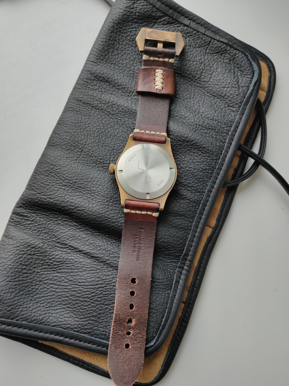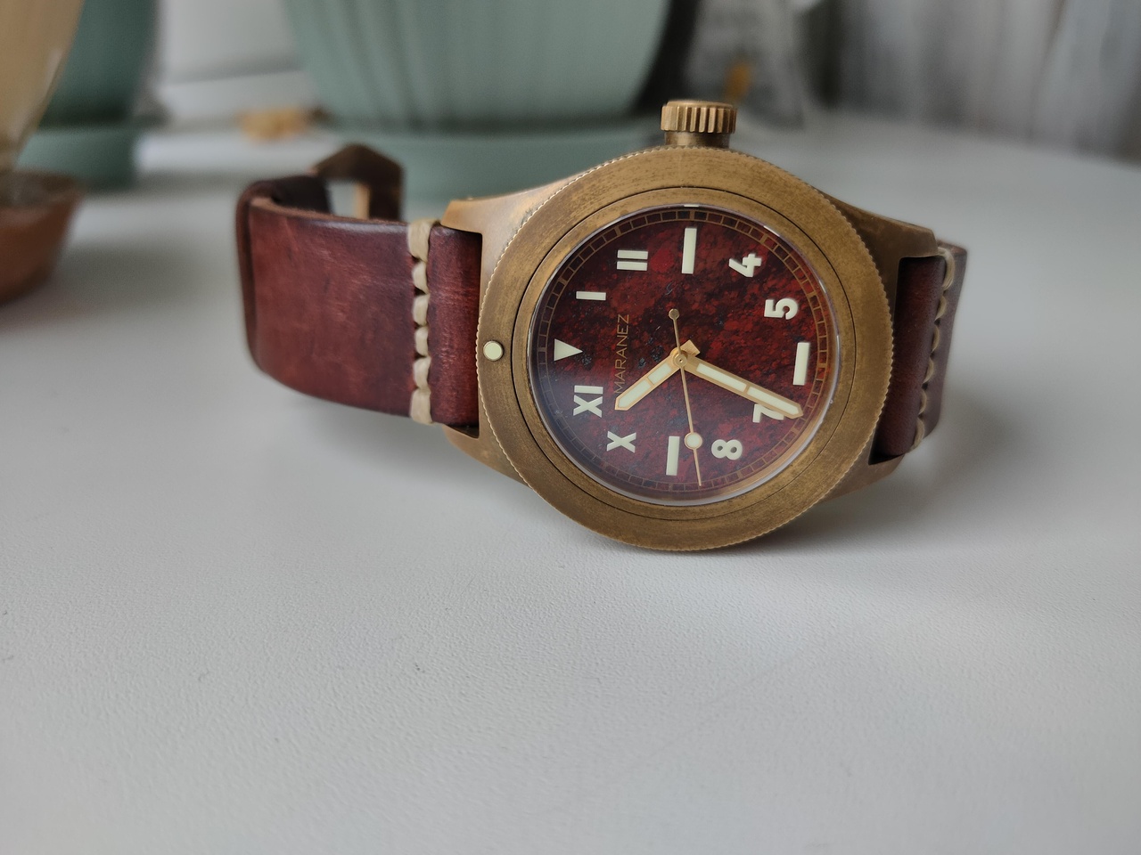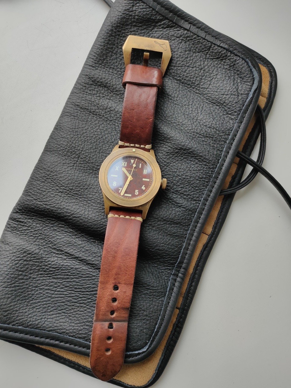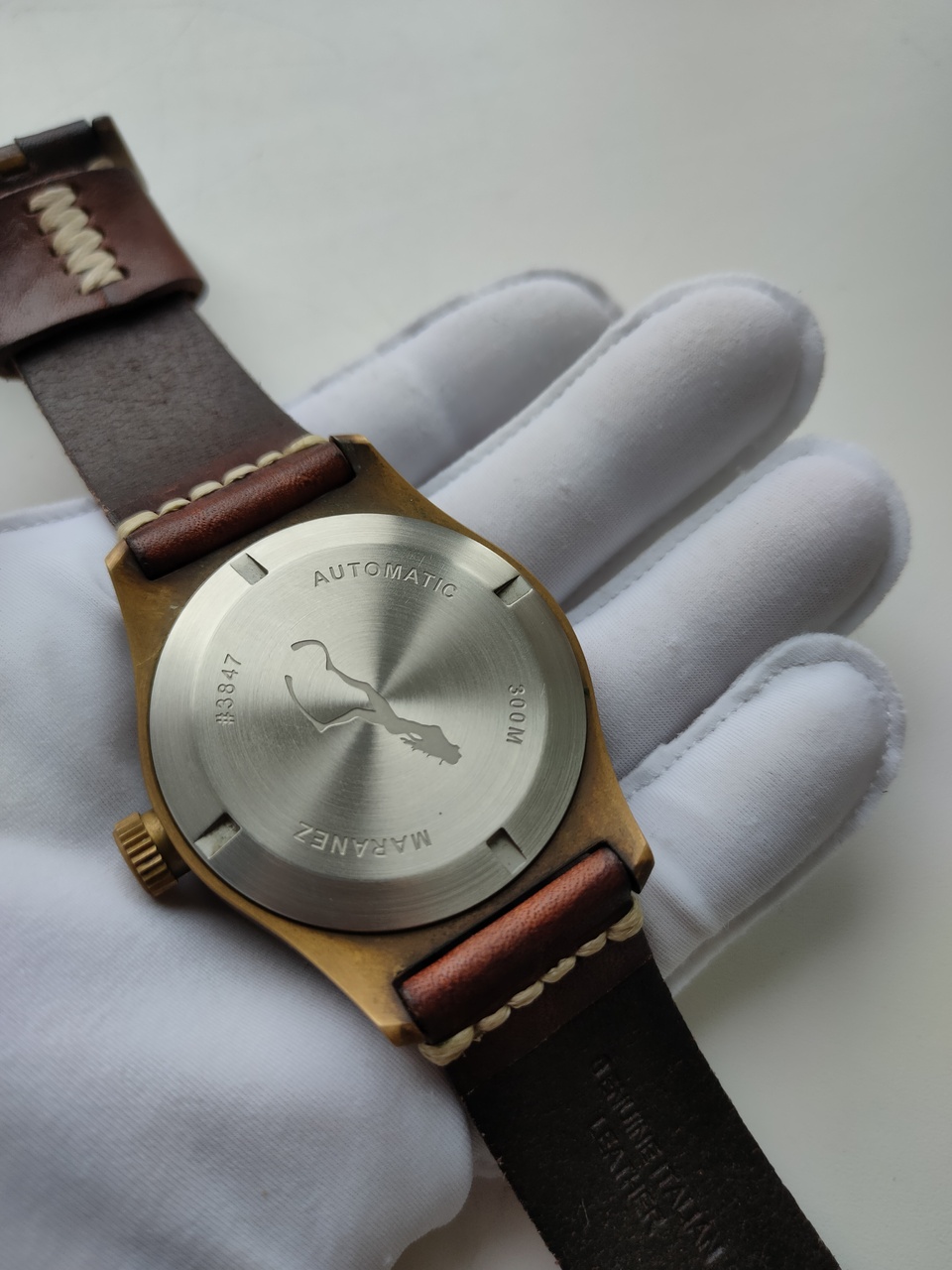 Предлагаю к продаже классный латунный Maranez. Продажа в связи с оптимизацией сета. Такие уже не выпускают. Шикарный цифер калифория из камня яшмы. Отличный сочный люм! Состояние "А" поставил с запасом. Под капотом надежный и проверенный временем NH35 от Seiko. Ход уверенный. Ремешок толстый качественный из итальянской кожи с крупной фирменной баклей с гравировкой аквалангиста. В комплекте кожаный чехол для переноски, инструмент для смены ремешков и НОВЫЙ оригинальный ремешок с крупной баклей. Цифер на солнце смотрится бомбически