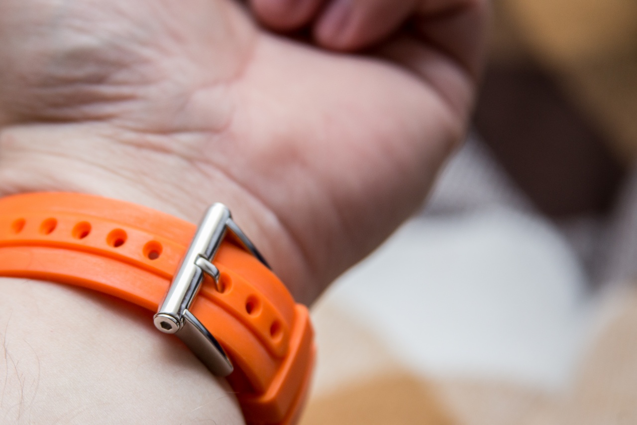 Ремешок полиуретановый, толстый, прочный, довольно удобен. Изначально загнут, из-за этого прочно обхватывает запястье и не жмет. Оранжевый цвет в тон меткам на циферблате. Внутренняя поверхность имеет рельеф в виде колец – отсыл к модели Окто – присоски осьминога. Бакля из нержавейки очень мощная. По длине – стандарт, но не такой длинный как например в дайверах Citizen.