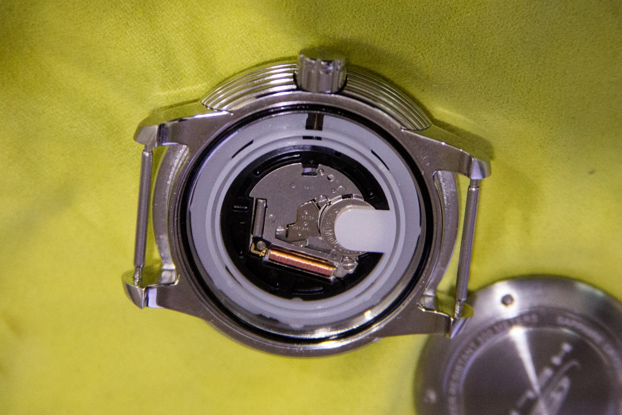 ЗГ довольно крупная, какой-либо защиты в виде наплывов корпуса нет, расположена на 3 часа. Имеет крупную накатку, но к сожалению тоже глянцевую поверхность, а если учесть, что она находится на сужающейся части корпуса, и «торчит» от безеля всего на пару-тройку миллиметров, не очень удобно ее откручивать, тонкие частые риски были бы здесь уместнее. Руке головка, по той же причине, совершенно не мешает, на торце находится красивая гравировка с аквалангистом.
