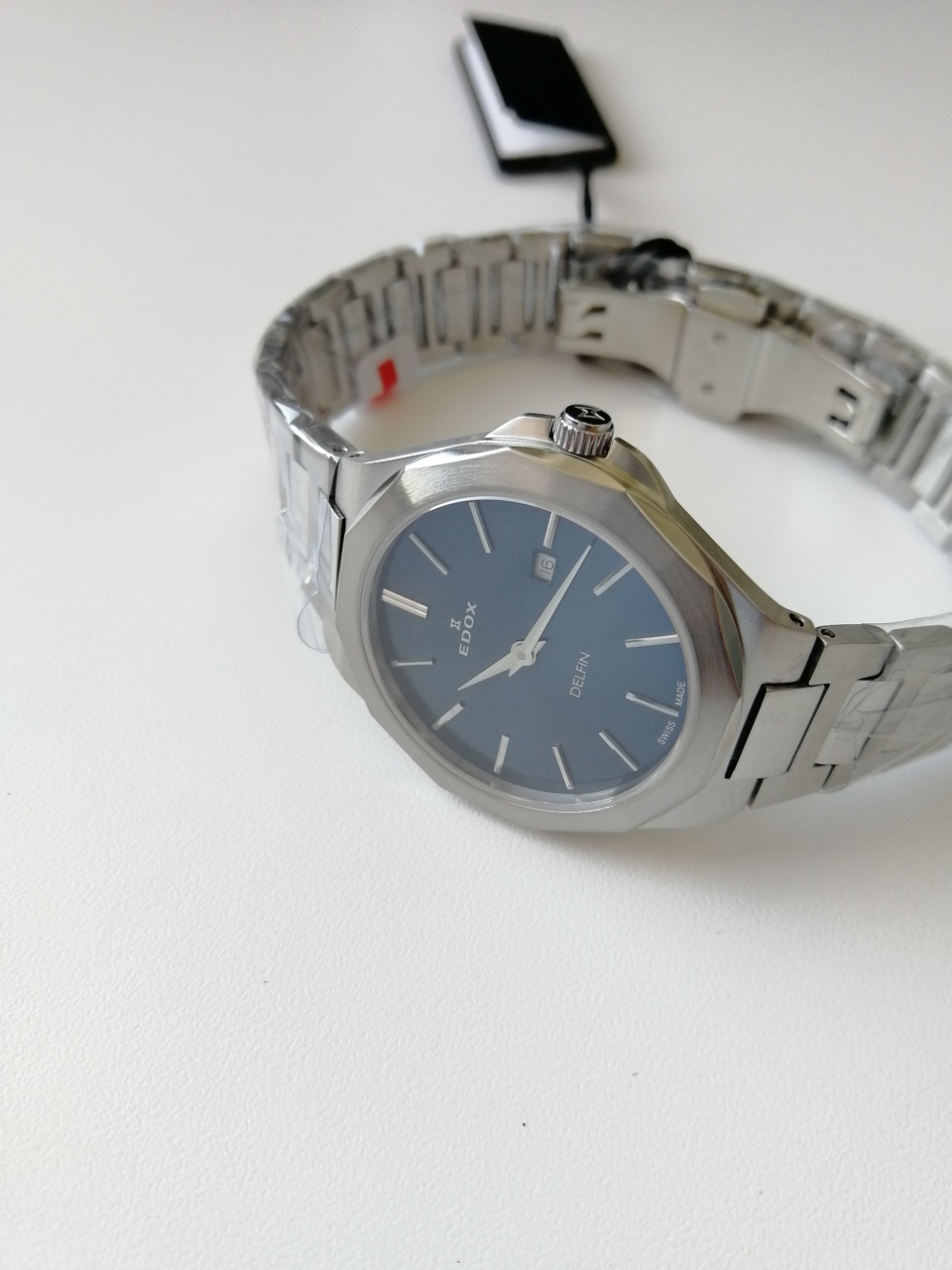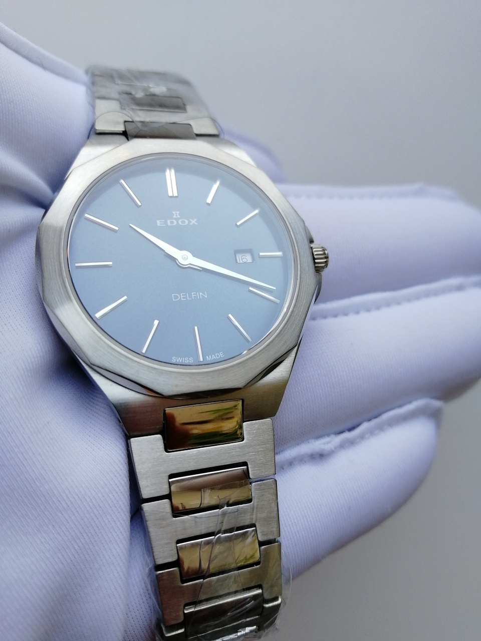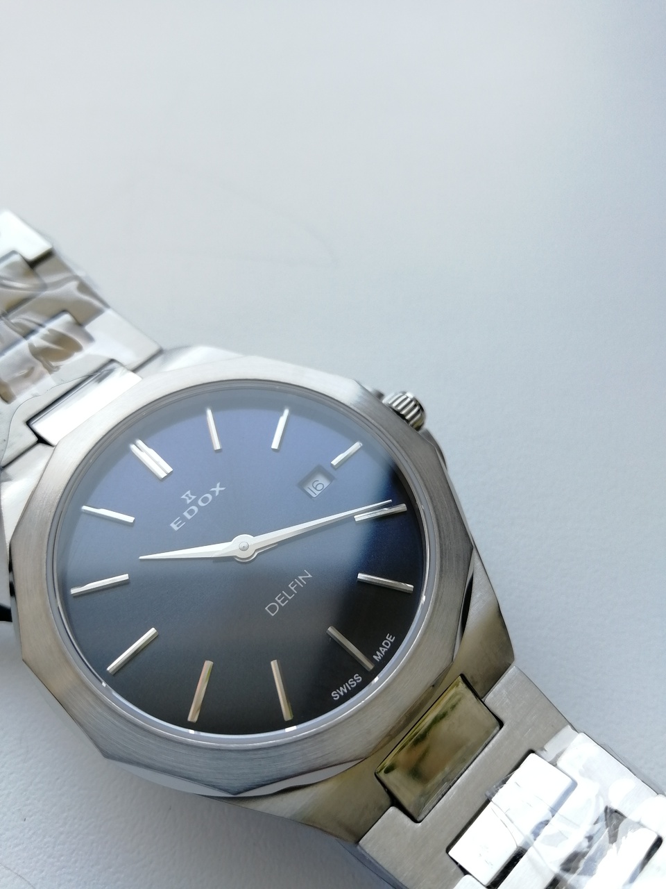 В продаже недавняя новинка от Edox. Замечательные легкие кварцевые часы с удобной посадкой. Запоминающийся, но, в то же время, строгий и лаконичный дизайн. Отличное качество отделки с сочетанием полировки и сатинирования, литой браслет. Глубокий насыщенный цвет цифера с эффектом sunburst, переливающийся от тёмно-синего до черного в зависимости от освещения, накладные метки. Вживую часы смотрятся очень солидно