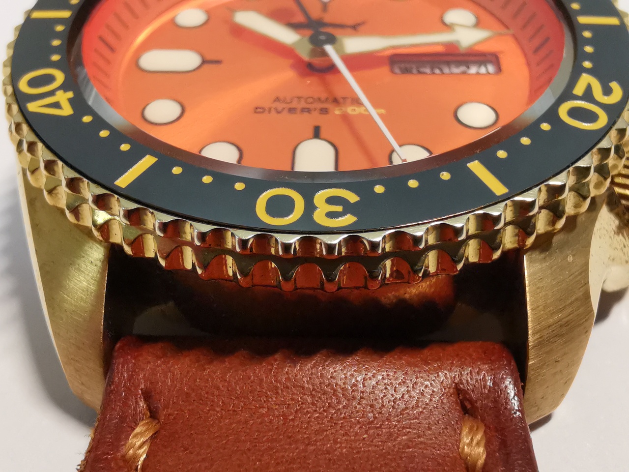 Безель, также как и корпус изготовлен из алюминиевой бронзы. Безель на 120 щелчков, высокий, 4мм,- по гурту нанесены зубчики в два ряда. Движение безеля ровное с небольшим усилием, у него практически нет движения в обратную сторону. Верхняя сторона безеля имеет черную керамическую вставку с нанесенными на нее основными минутными делениями. Деления выполнены в виде углублений заполненных краской светло-желтого цвета, без люма. Выглядит довольно винтажно. На метке соответствующей 12 часам имеется аккуратная жемчужина, с люминофором отличного качества.