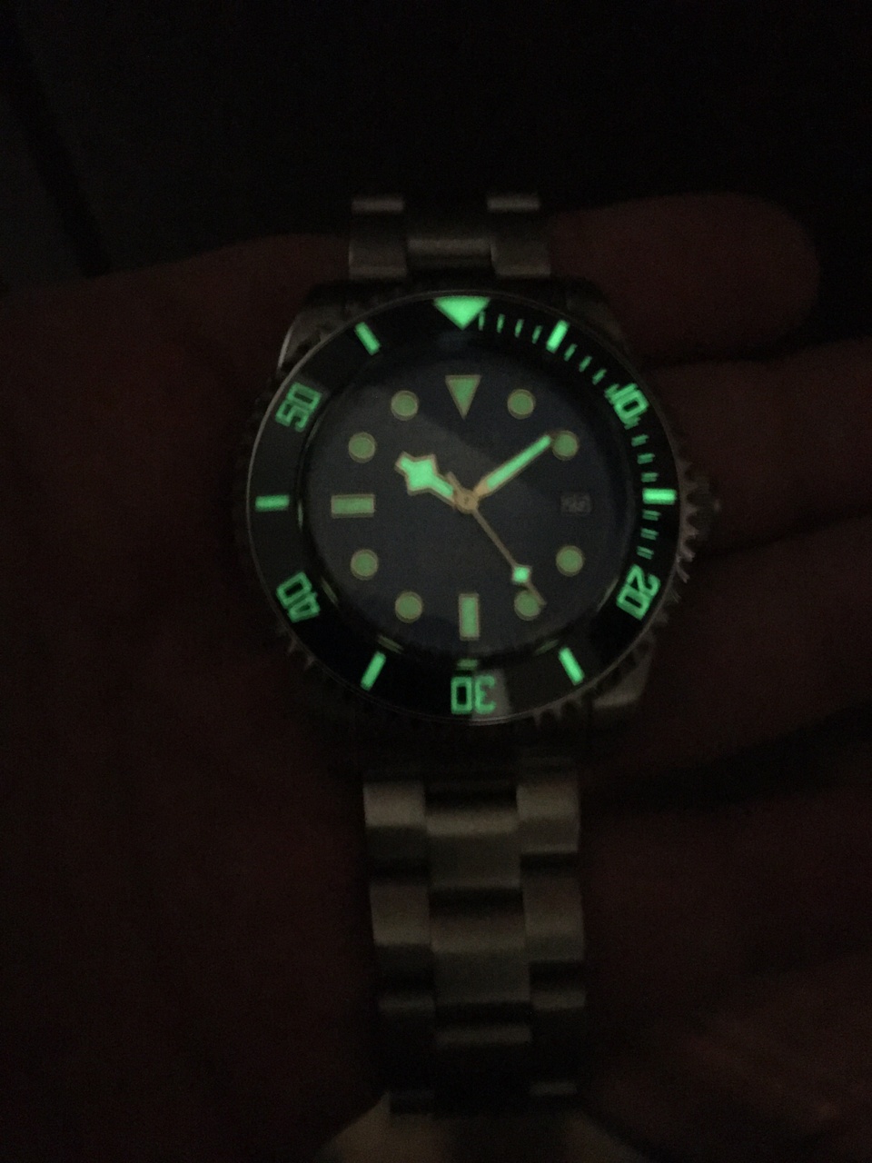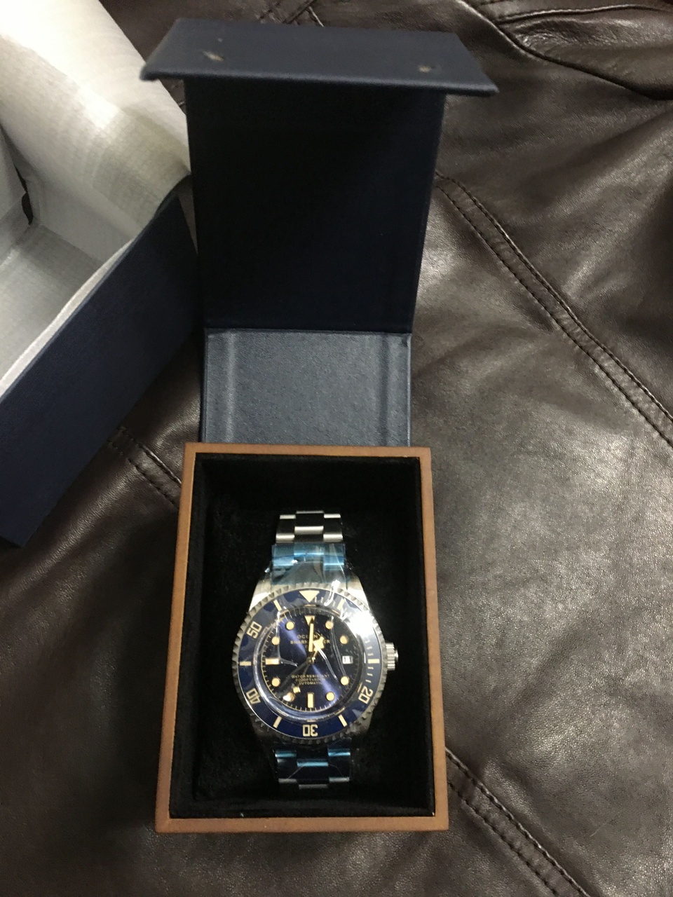 1. Sharkmaster 600. Как можно уже догадаться, это дайверские часы с водозащитой 600 м. Купольный 3,8мм сапфир, керамический безель со светящимися метками, гелиевый клапан, шикарный циферблат с эффектом "солнечные лучи" и неубиваемый механизм Seiko NH35A. Корпус 43мм, неплохо сидит на руке. Выполнен в стиле - а ля Тюдор. Браслет типа "уйстер".