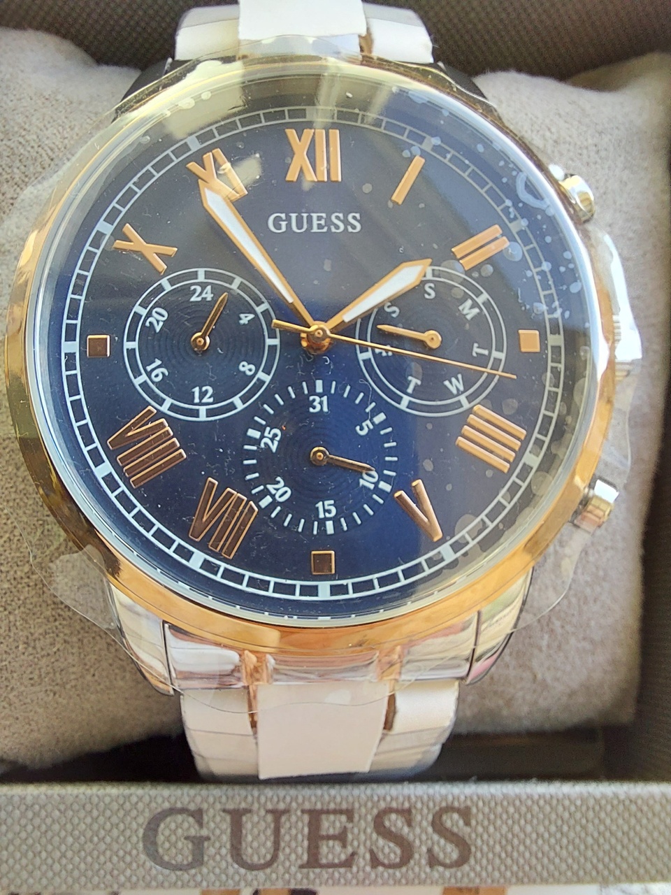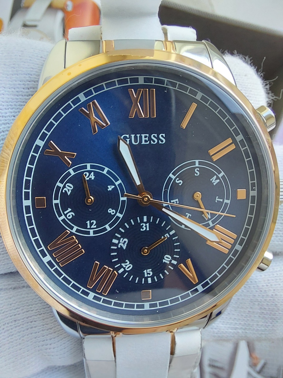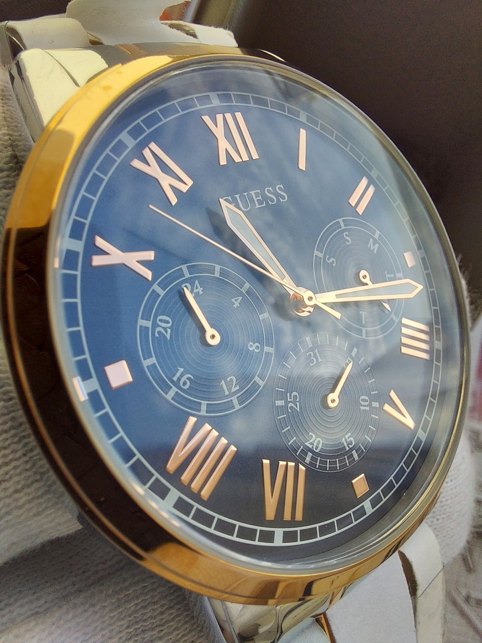 В ПРОДАЖЕ МУЖСКИЕ ДВУХЦВЕТНЫЕ ЧАСЫ GUESS HENDRIX BLUE DIAL W1309G4 КРУГЛОЙ ФОРМЫ. КОРПУС ВЫПОЛНЕН ИЗ НЕРЖАВЕЮЩЕЙ СТАЛИ С ДВУХЦВЕТНЫМ БРАСЛЕТОМ ИЗ НЕРЖАВЕЮЩЕЙ СТАЛИ (СЕРЕБРИСТЫЙ И ОТТЕНОК РОЗОВОГО ЗОЛОТА). ФИКСИРОВАННЫЙ ЗОЛОТИСТЫЙ БЕЗЕЛЬ. СИНИЙ ЦИФЕРБЛАТ СО СТРЕЛКАМИ В ФОРМЕ МЕЧЕЙ ЦВЕТА РОЗОВОГО ЗОЛОТА И ЧАСОВЫМИ МЕТКАМИ С РИМСКИМИ ЦИФРАМИ. МИНУТНЫЕ МАРКЕРЫ ПО ВНЕШНЕМУ КРАЮ. ЛЮМИНЕСЦЕНТНЫЕ СТРЕЛКИ. ИНДИКАЦИЯ ДАТЫ В ПОЗИЦИИ "6 ЧАСОВ". ОТОБРАЖЕНИЕ ТРЕХ МНОГОФУНКЦИОНАЛЬНЫХ ДОПОЛНИТЕЛЬНЫХ ЦИФЕРБЛАТОВ: ДАТА, ДЕНЬ НЕДЕЛИ и 24 ЧАСА.