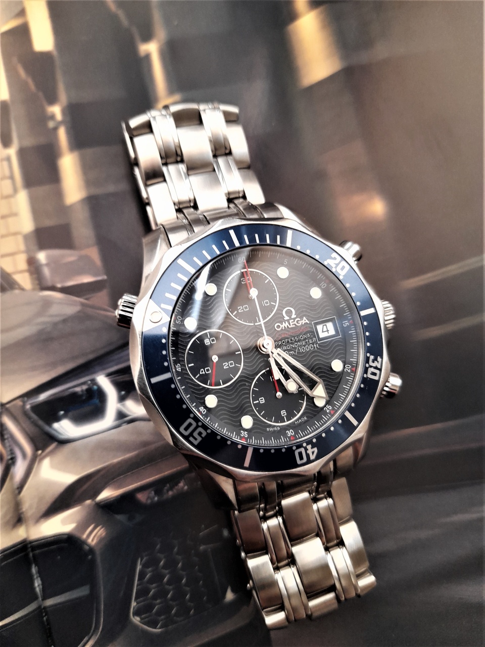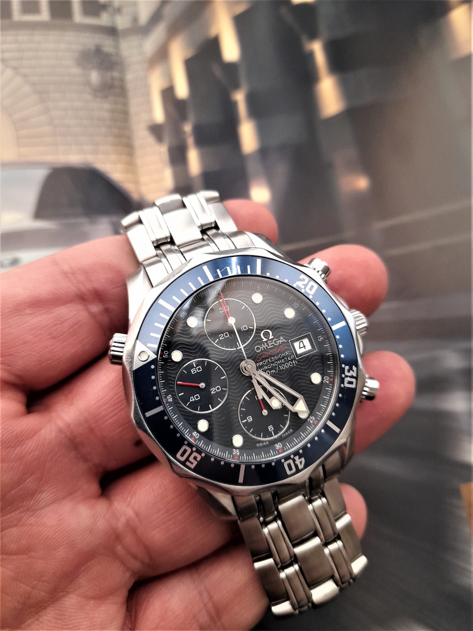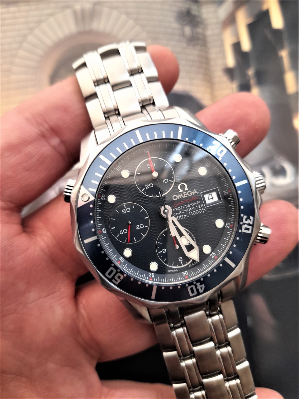 культовый дайверский хронограф из линейки Seamaster. Часы в превосходном внешнем и техническом состоянии. Ходят в 0-1 сек, амплитуда за 300. В таком состоянии найти практически невозможно и будет сложнее с каждым днем. Стоимость - тем более с новыми колебательными реалиями ценников привязанных к курсу - со временем будет только расти. Без комплекта. Браслет на руку 19 см.