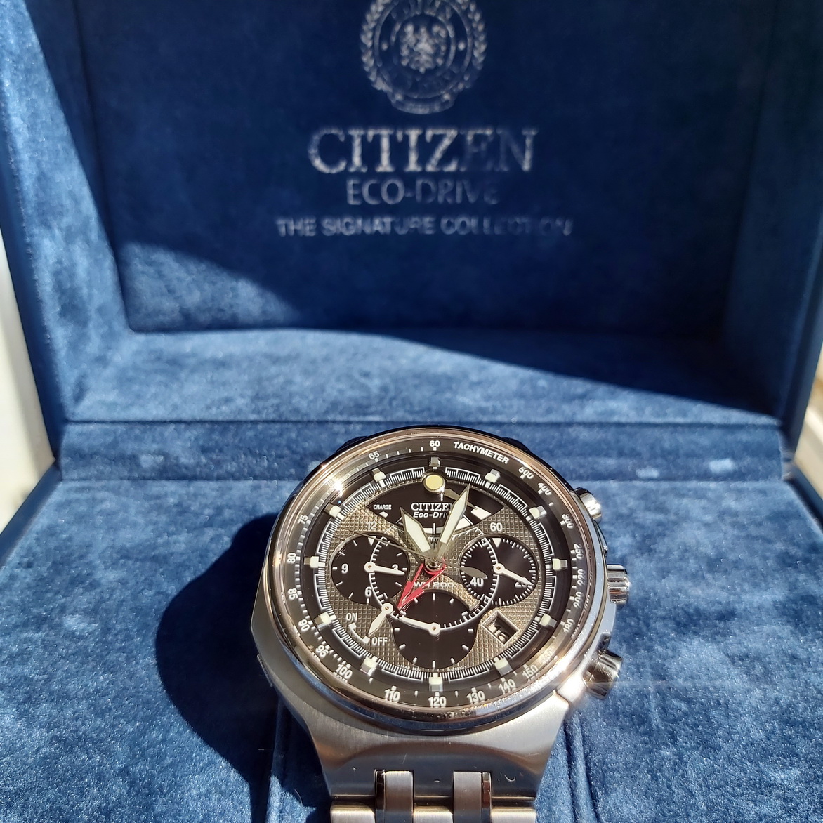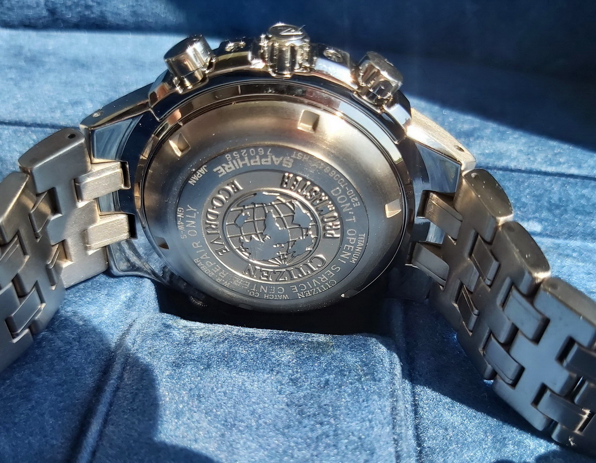 Титановая версия. Чистая Япония. Сапфировое стекло в идеале. WR200 метров. Будильник. Дата. Индикатор заряда батареи. З/Г на резьбе. Шикарный хронограф с плавной секундной стрелкой. Отличный подвижный литой браслет на руку до 20,5 см. Запасных звеньев нет. Небольшие потёртости на застёжке браслета. Технически в идеале. Не тонули, не разбирались, не ремонтировались) Аккумулятор всегда на максимуме. Точность хода +2 сек. в месяц.
