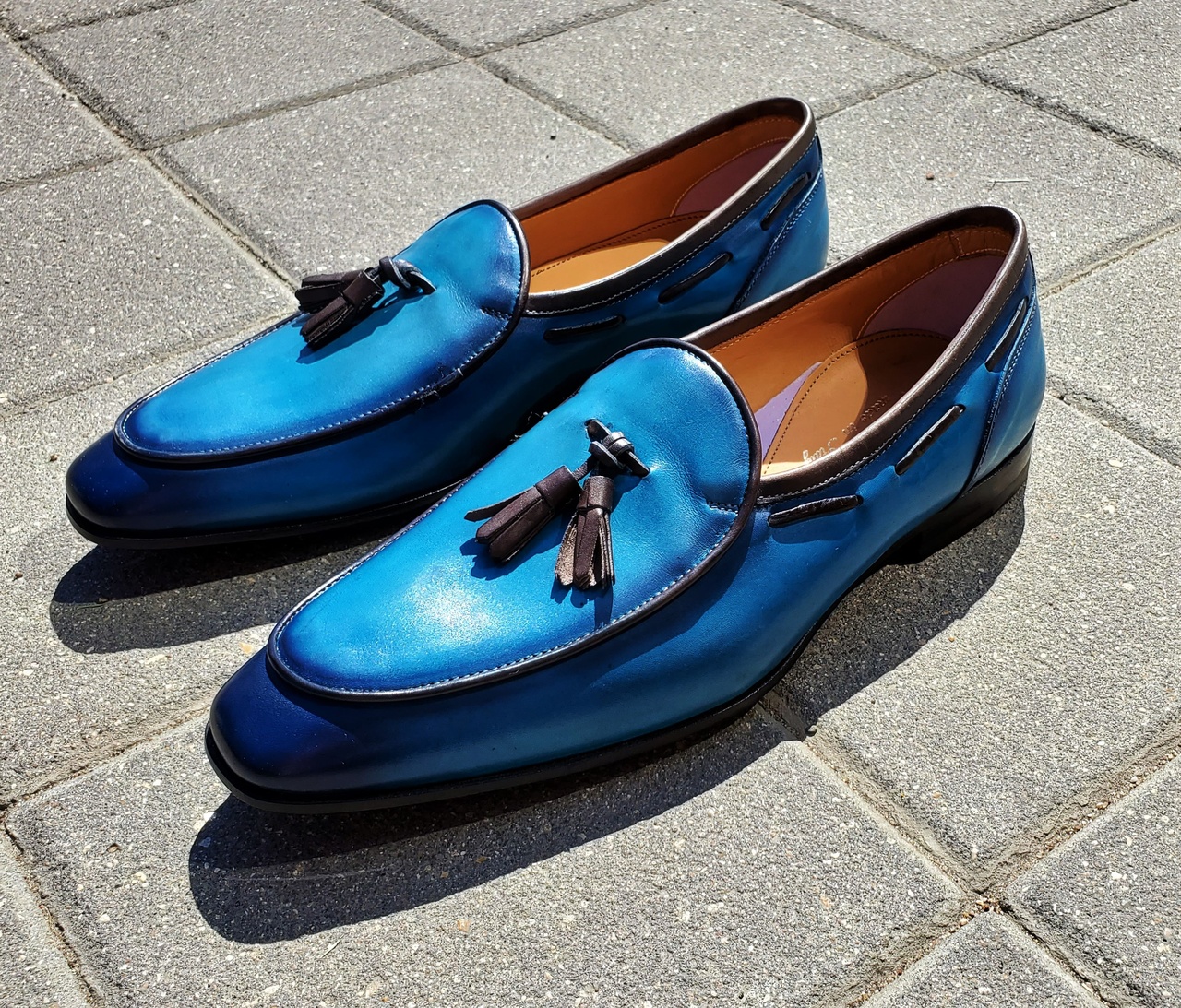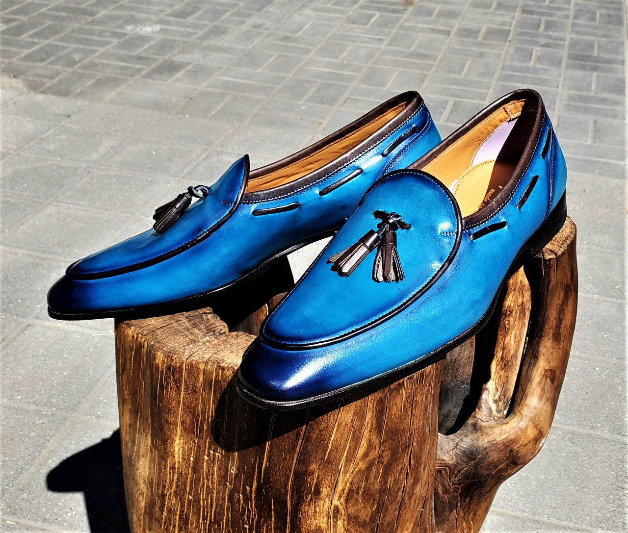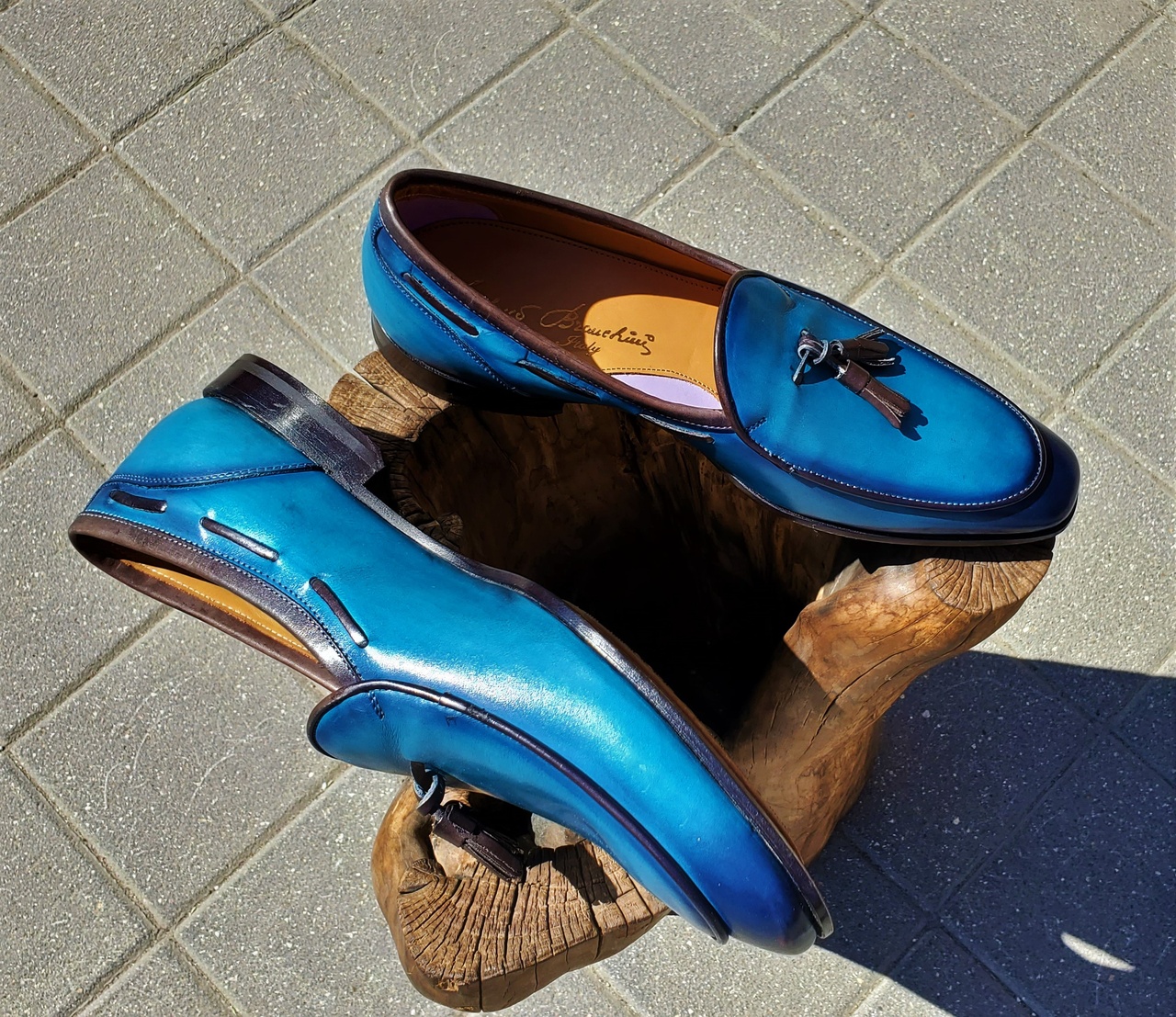 Изготовлены из комбинированной 100% телячьей кожи высочайшего качества выделки, окрашенной полностью вручную в «лазурный синий» цвет с эффектом патинирования «антик».