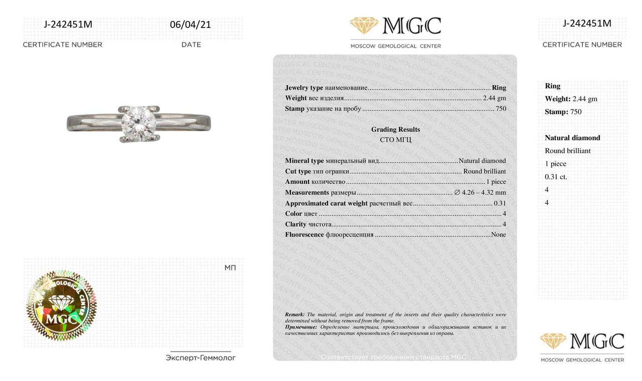 Кольцо из белого золота с бриллиантом 0,31 карат (сертификат МГЦ)