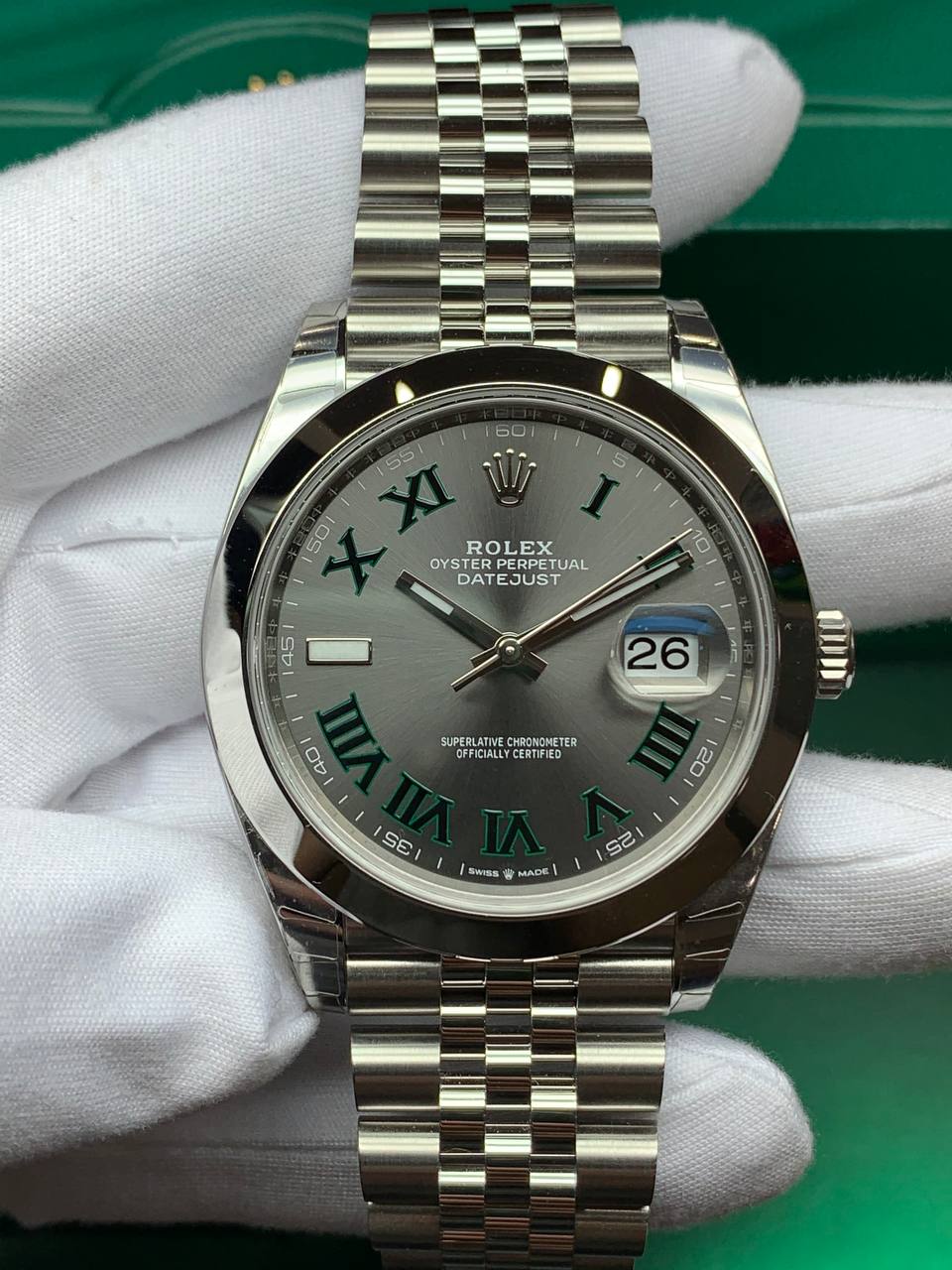 Новая модель с лучистым серым циферблатом и зелеными римскими цифрами циферблатом Datejust 41 Steel Smooth Bezel Jubilee 126300 на стальном браслете Jubilee, была представлена на Baselworld 2017 оригинальным брендом Rolex с видоизмененным стальным корпусом, размером в 41 мм и новым часовым калибром 3235.