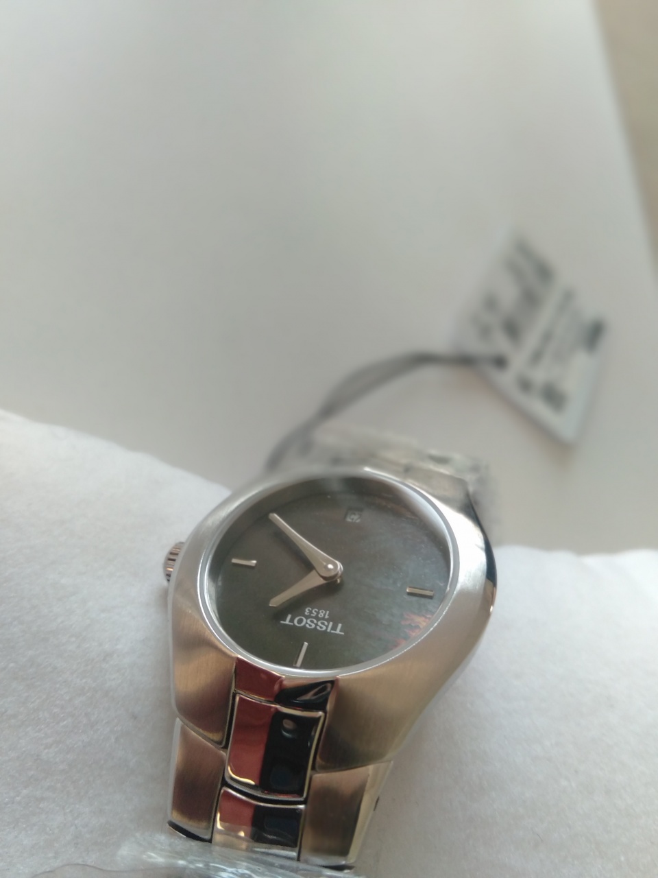 Восхитительный перламутровый циферблат черного цвета, меняющий цвет в зависимости от угла обзора, сапфировое стекло, создающее эффект "без стекла", металлический корпус стального цвета, плавно переходящий в металлический браслет граненого плетения, за счет игры света на гранях также создается эффект изменения цвета.