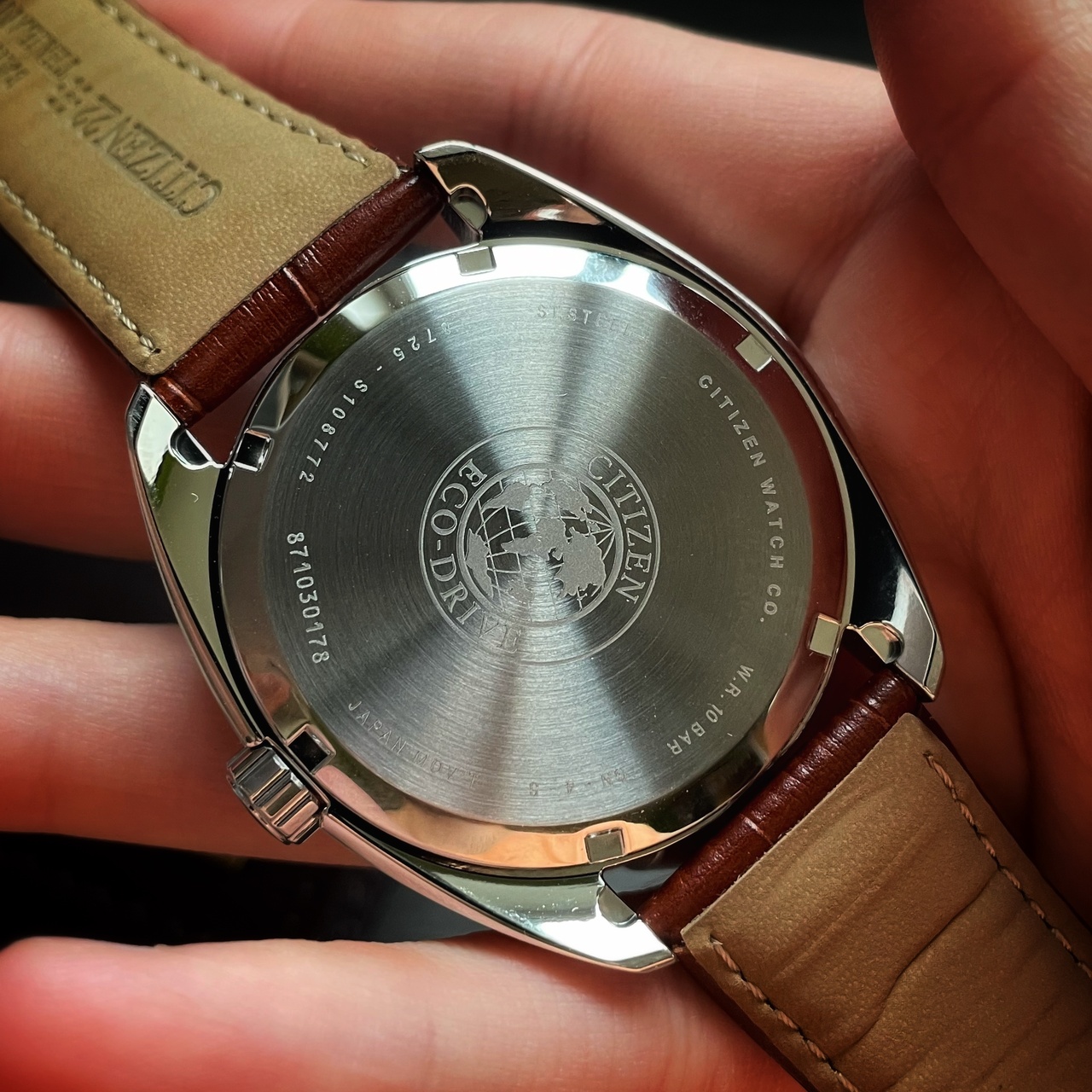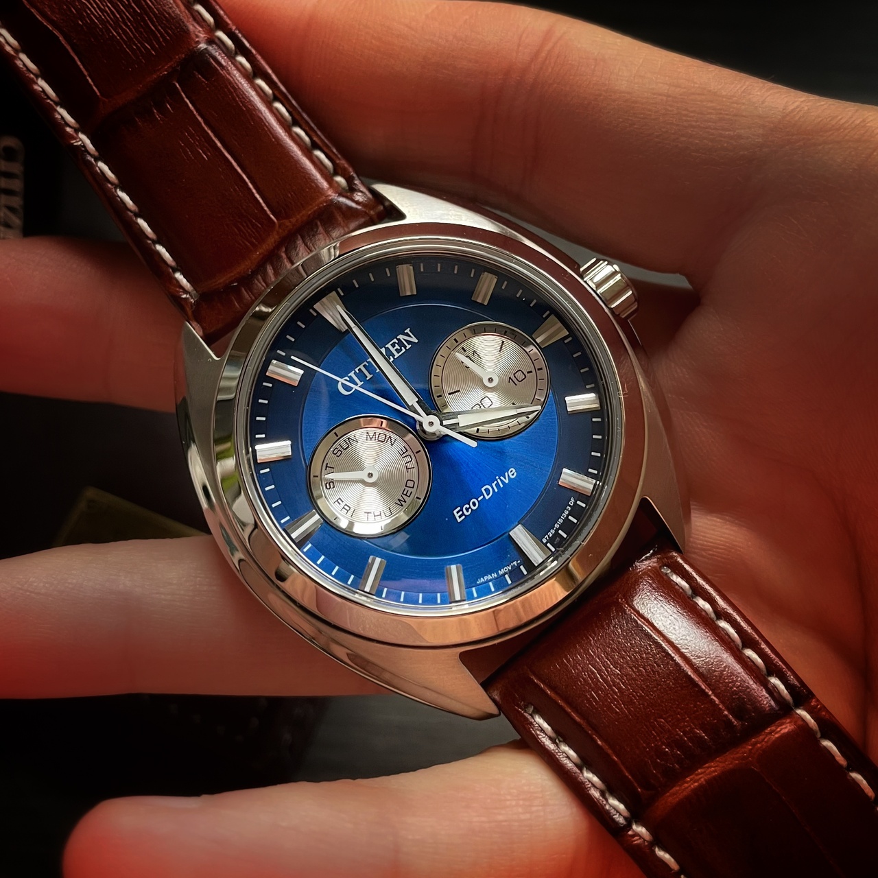 Японские Citizen с синим циферблатом на кожаном ремне. BU4010