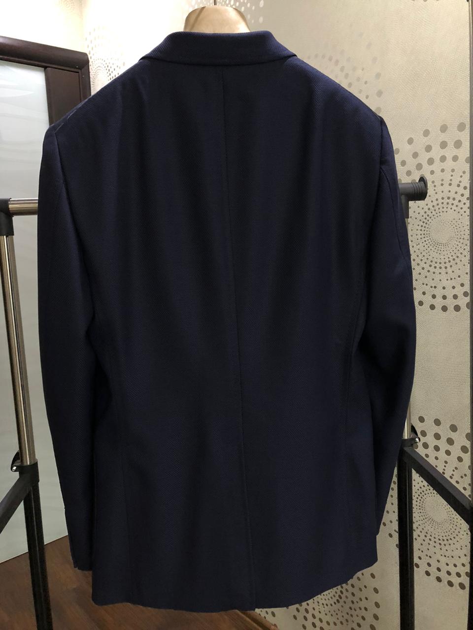 Дизайнер включил в классическую коллекцию однобортный шерстяной пиджак тёмно-синего цвета.Для пошива приталенной модели мастера марки использовали мягкую фактурную шерсть,которая хорошо держит форму и меньше пачкается.Изделие с двумя накладными карманами,кармашек на груди,застёгивается на две пуговицы золотистого цвета.Подкладка выполнена из ткани купро с добавлением шёлка.Разрез сзади.
