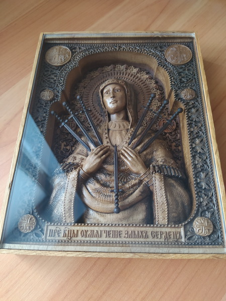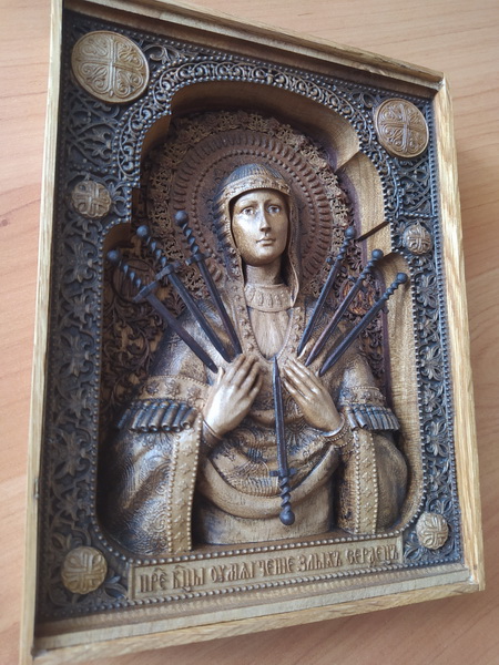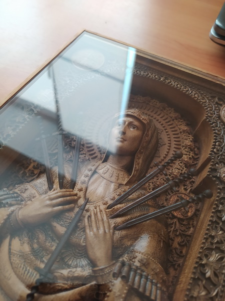 Одна из самых почитаемых икон. Качество и степень детализации на фото. Икона выполнена из светлого ореха, подложка и рамка - дуб, нимб - красное дерево, решетка на подложке - темный орех, мечи - темных орех. Защитное стекло установлено для сохранности плотной посадкой без клея, может быть легко снято или закреплено капелькой клея (но оно и так само собой не выпадет). В такой сложности работа скорее всего повторяться не будет из-за огромной трудоемкости и технологической сложности. Шикарный подарок супруге, маме, сестре. Технология - ЧПУ, фреза 0,25 и руки, руки, руки. Пропитка - только натуральное, химией не пользуюсь никогда. Масла с восками (хитрая смесь) и сиккатив для ускорения полимеризации.