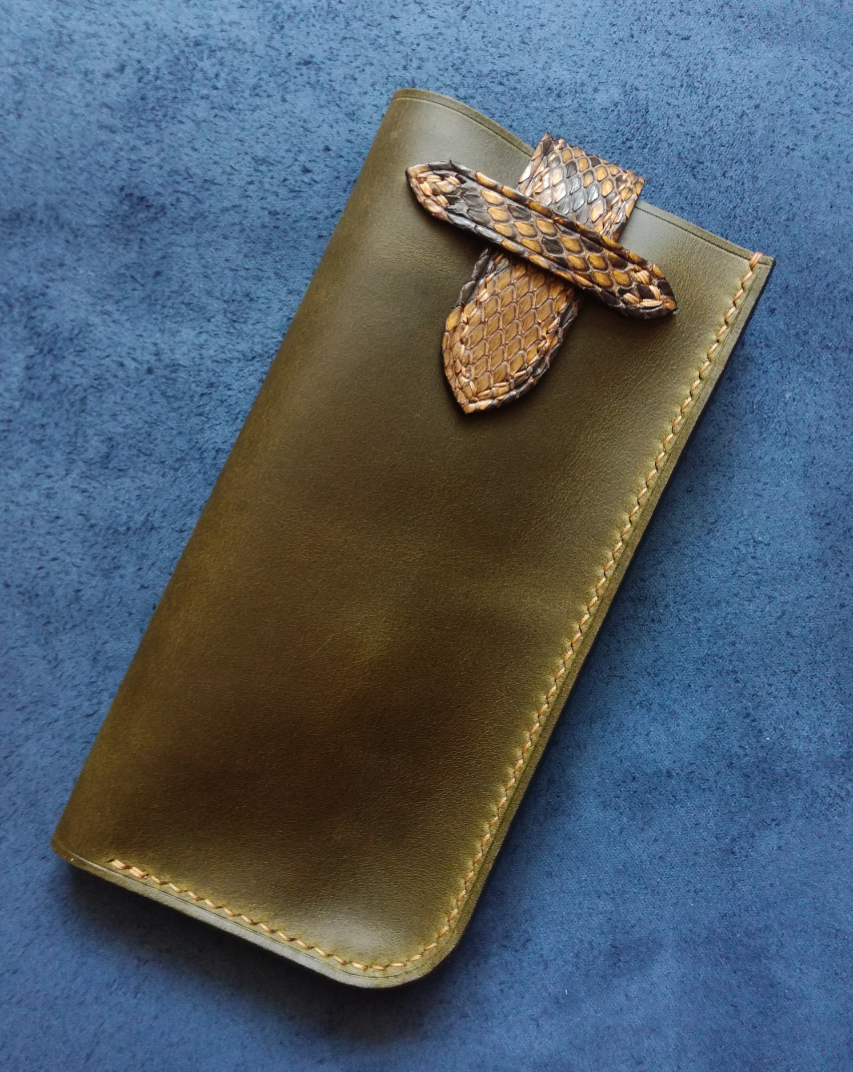 В продаже абсолютно новый чехол для очков, изготовленный из теленка в оливковом цвете с застёжкой из коричневого питона.