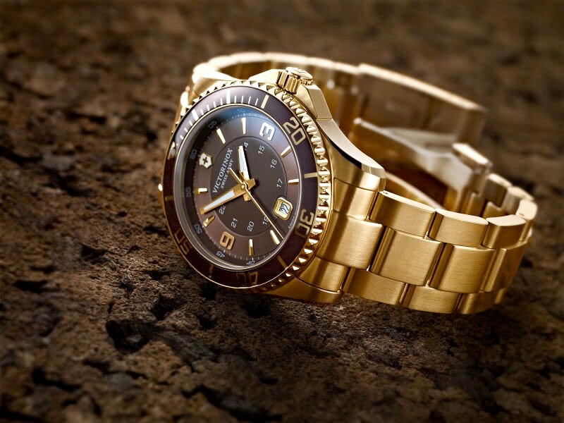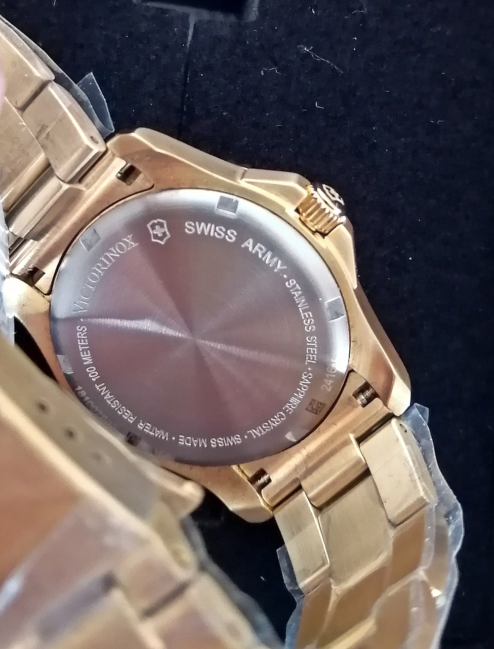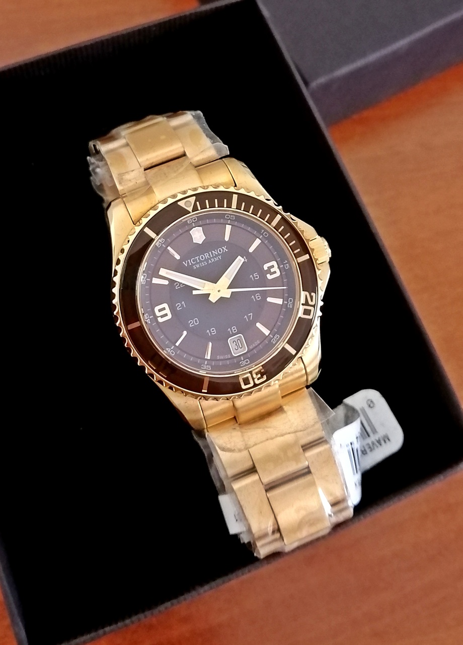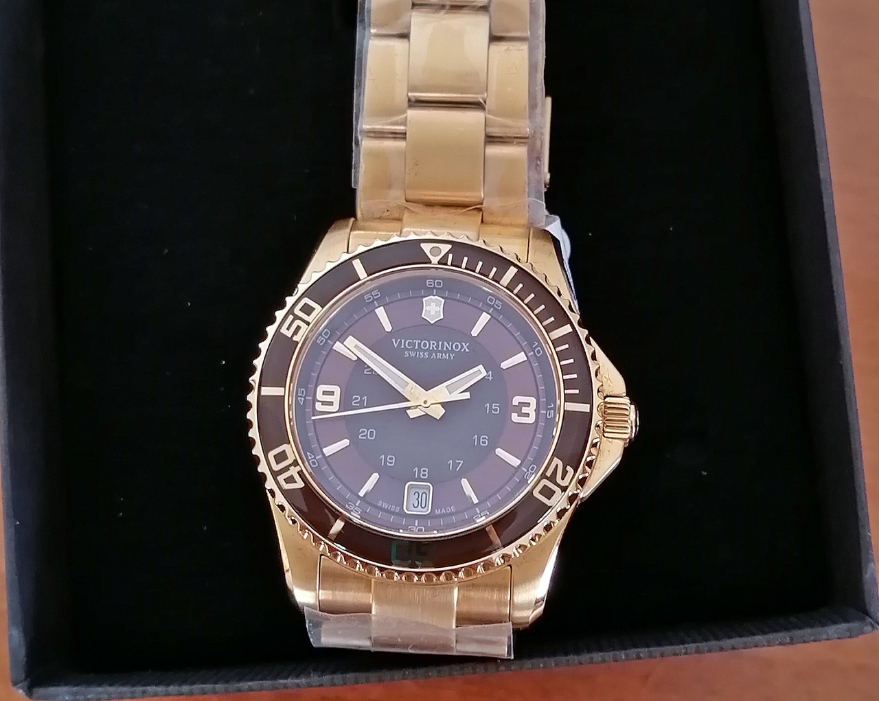 В продаже классические женские часы Victorinox MAVERICK SMALL. Стальной корпус, диаметр 34 мм с PVD оттенка "Желтое Золото" и специальным покрытием, устойчивым к воздействию UV-лучей, накладные цифры, люминесцентное покрытие на стрелках, сапфировое стекло с тройным антибликовым покрытием, водонепроницаемость до 100 м, стальной сатинированный браслет с PVD-покрытием, раскладывающаяся пряжка с двойной блокировкой, вращающийся безель, шикарный коричневый циферблат. В комплекте фирменная транспортировочная коробка, книжка, часы. Швейцарский кварцевый механизм Ronda 705, индикация даты. Пересыл без проблем.