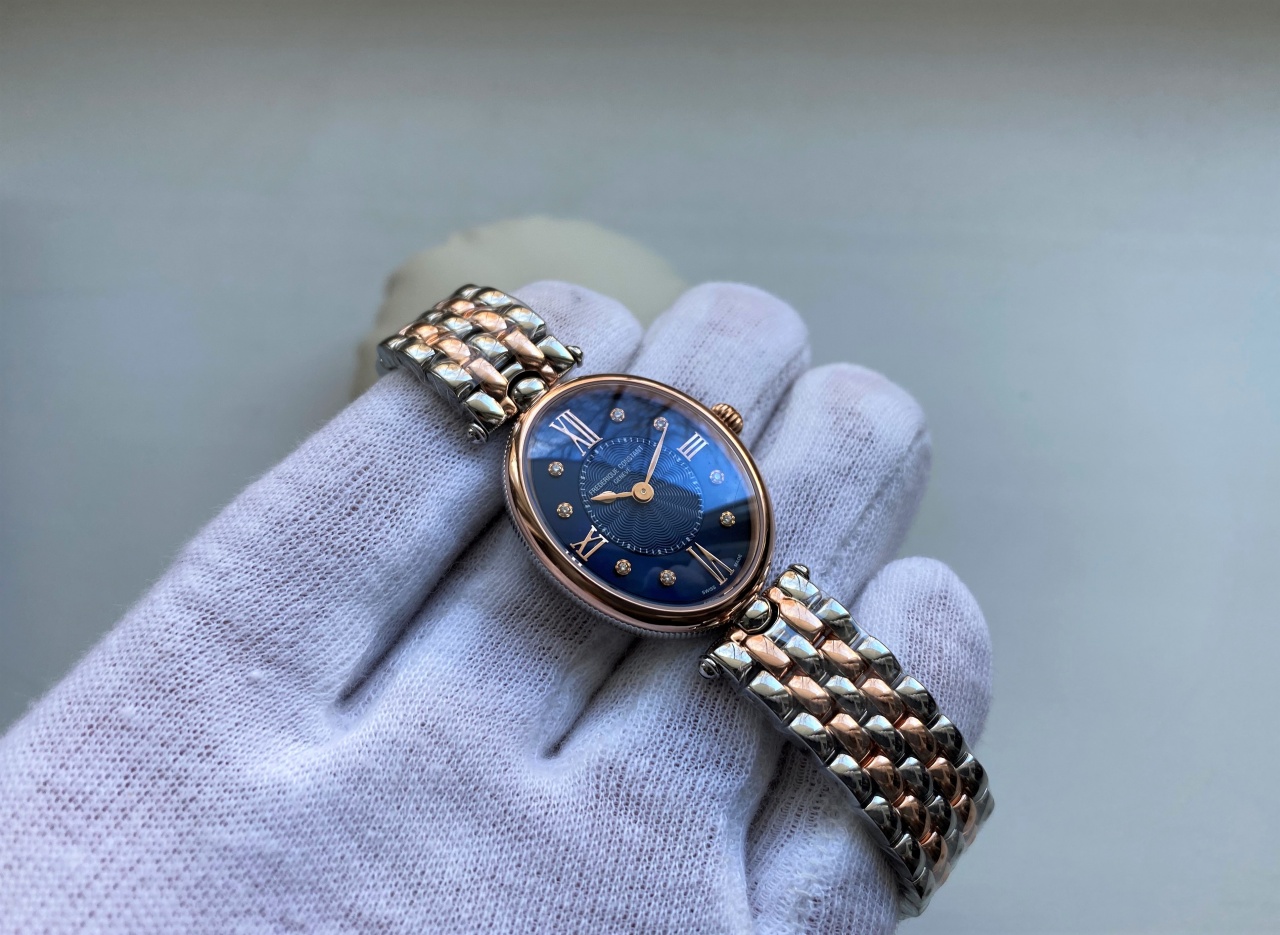 Синий циферблат с гильоше, 8 бриллиантов, усложненное оформление корпуса, биколорный браслет, диаметр 30х25мм.