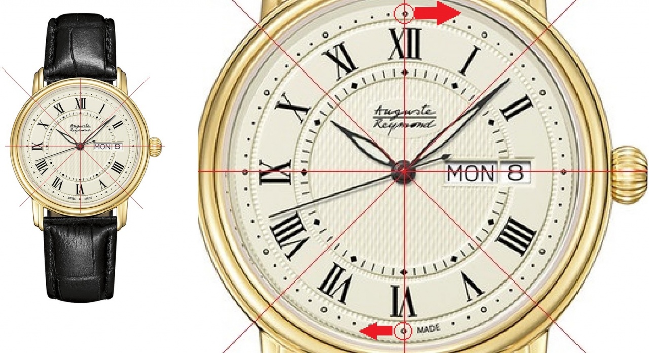 Дома решил скачать фотографию в большом разрешении с сайта производителя и провести оси для проверки правильности нанесения меток. Оказалось, что самый верхний и самый нижний кружочек на циферблате (на цифрах XII и VI) действительно нанесены неровно и чуть-чуть не совпадают с вертикальной осью. По горизонтальной оси все окалось нормально, но глаз все равно за что-то цепляется и кажется, что циферблат немного завален по часовой стрелке. Кроме того, обратил внимание, что в цифре VI символ "V" тоже нанесен не совсем ровно (чуть-чуть наклонен по ходу движения стрелки).