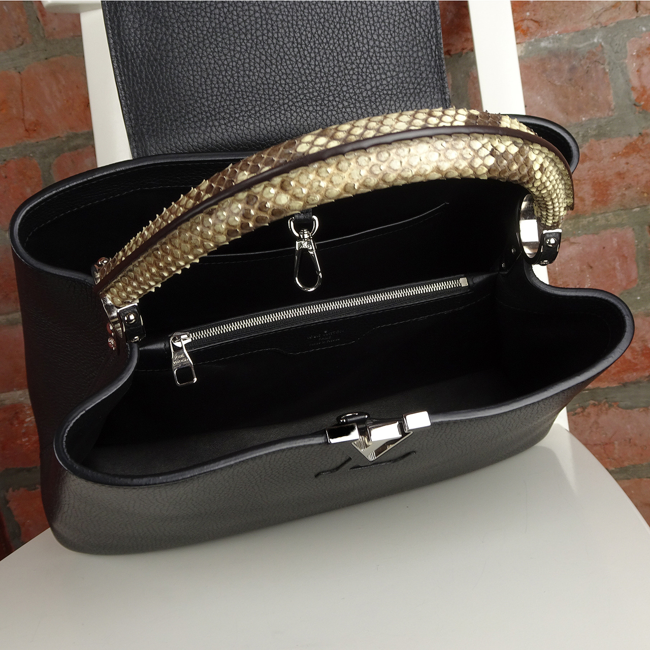 "Названная в честь улицы Rue de Capucines, где в 1854 году Луи Вюиттон открыл свой первый магазин, неизменно роскошная и элегантная сумка Capucines является образцом высокого мастерства Louis Vuitton. Крупнозернистая кожа Taurillon в сочетании с великолепной кожей питона, украшена деталями, напоминающими о наследии Дома: инициалами LV, роскошными кольцами-креплениями и искусным цветком Monogram на крышке. Сумку можно носить двумя способами: клапаном наружу, демонстрируя контур цветка Monogram, или клапаном внутрь, открывая логотип LV. Благодаря двум просторным внутренним отделениям эта сумка прекрасно подойдет как для работы, так и для прогулок по магазинам."