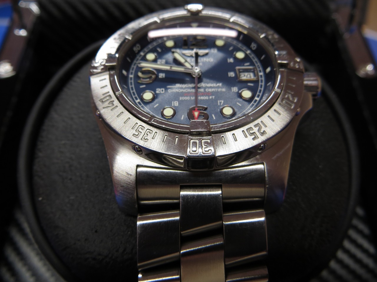 Часы в отличном состоянии, все матовые поверхности на месте, не полировались! Без репассажей и тп вмешательств, ход очень точный, без видимых отклонений за несколько дней. На руку надевались крайне редко, хранятся в электрической шкатулке. Есть шанс пополнить коллекцию действительно достойной вещью!. В подарок отдам шкатулку и оригинальный кожаный ремешок Breitling синего цвета.