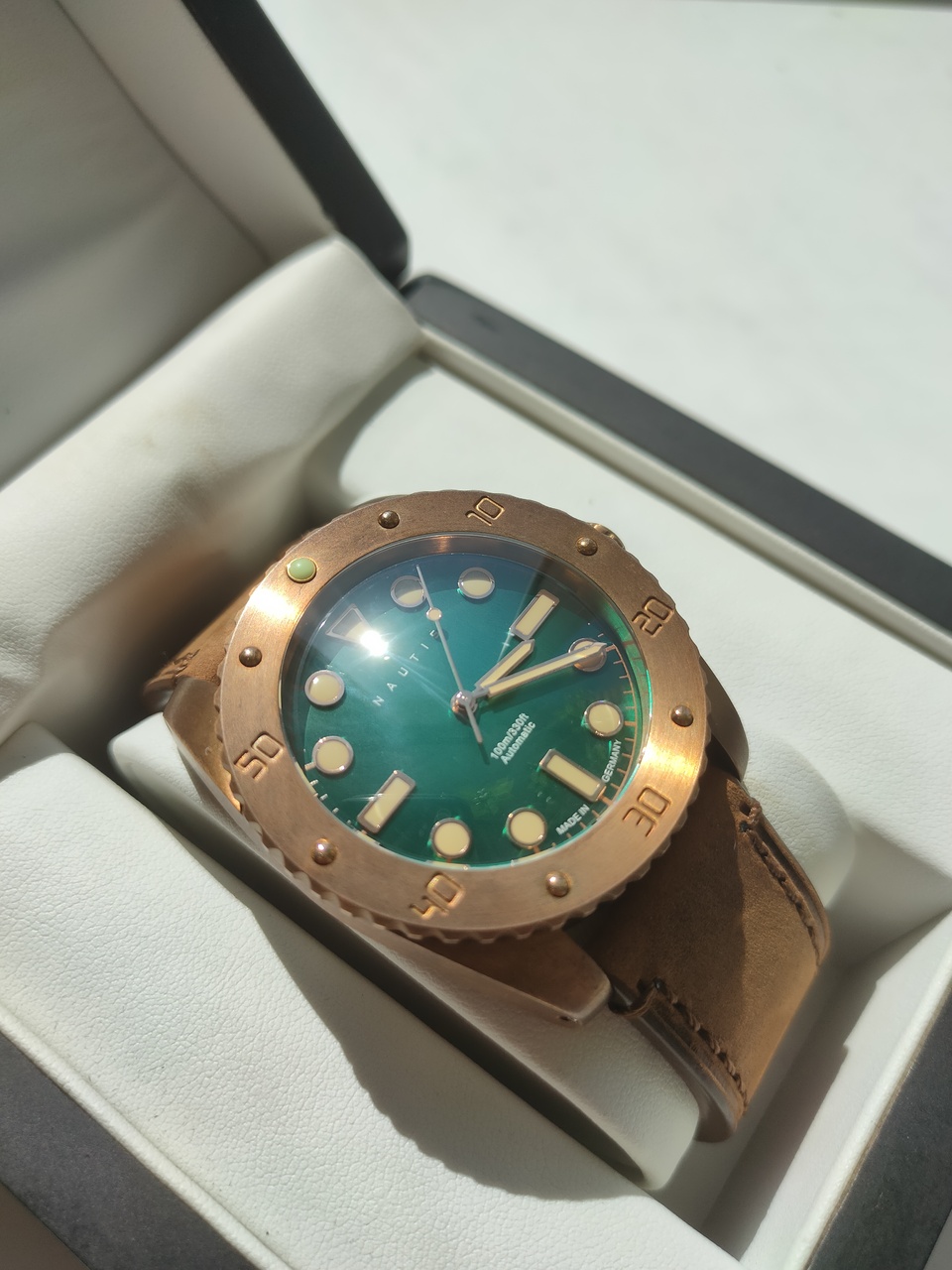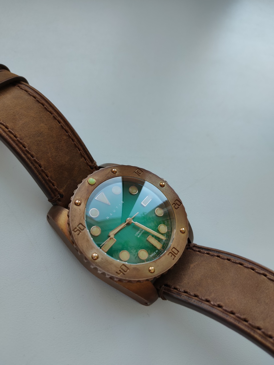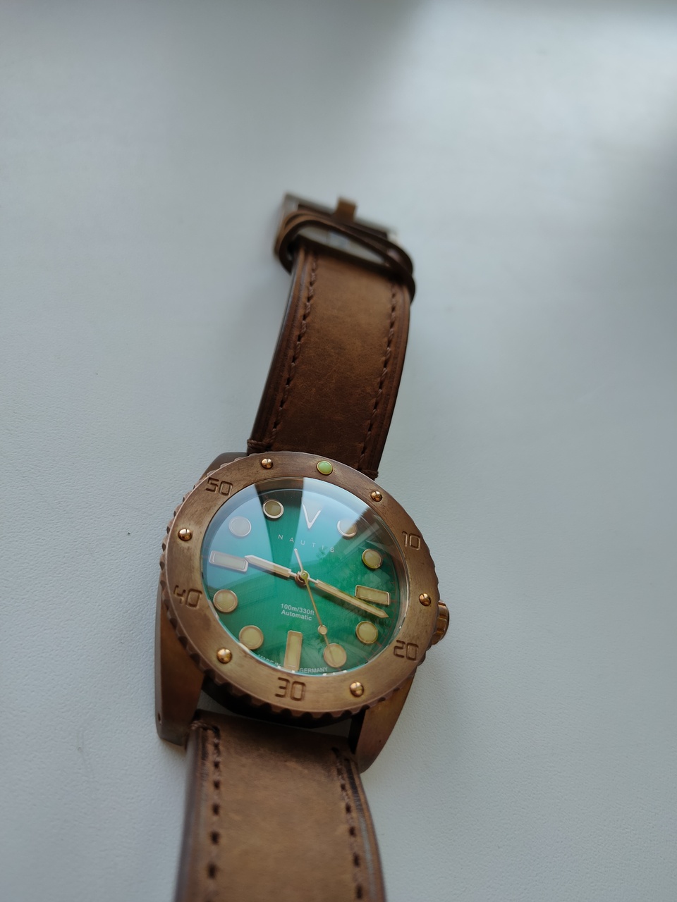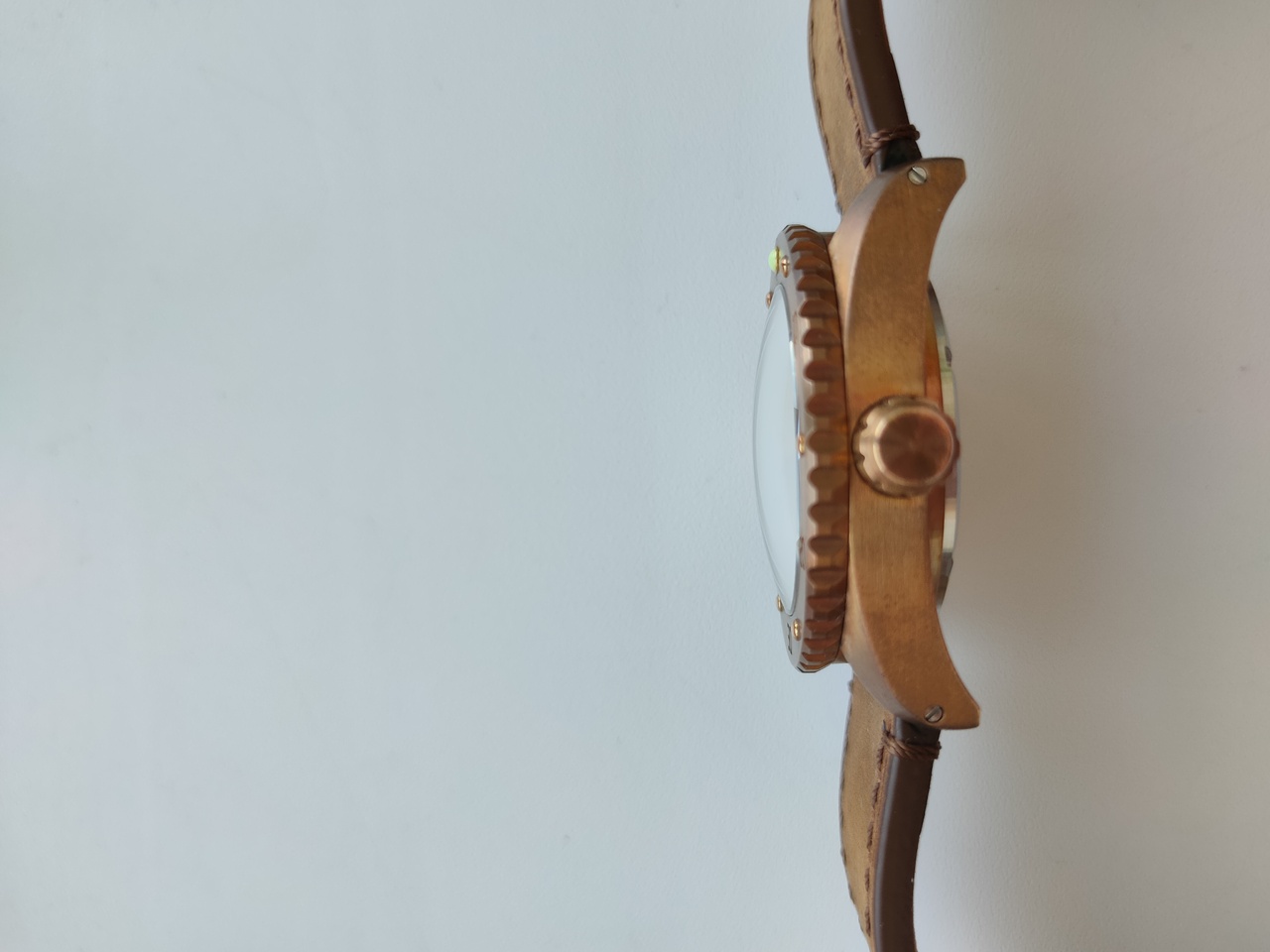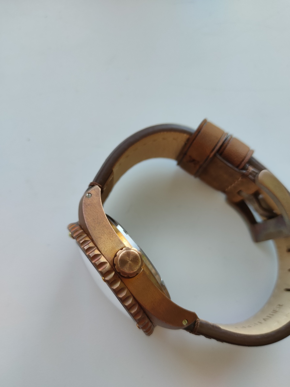 В продаже шикарная бронза из личной коллекции. Состоянии АА поставил с запасом. Считаю, что оно ближе к ААА. Под капотом надежный и проверенный временем NH35A от Seiko. Родной всего несколько раз одетый ремень очень крутого качества - толстый, мягкий, с отличной прострочкой и крупной бронзовой баклей. Несмотря на солидный размер, за счет коротких и правильно загнутых ушек, отлично садятся даже на запястье 17 см.