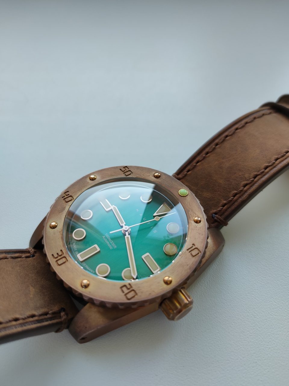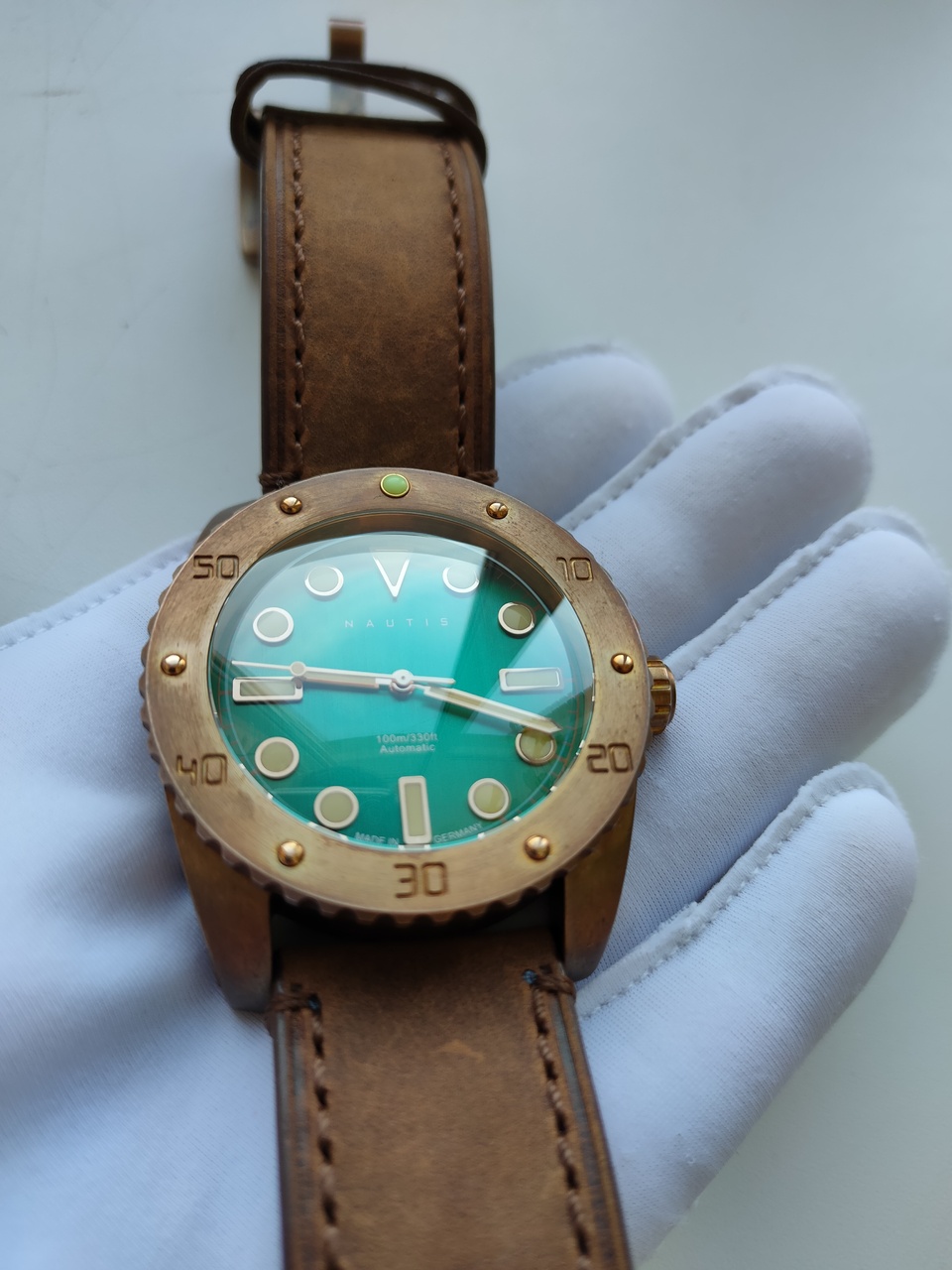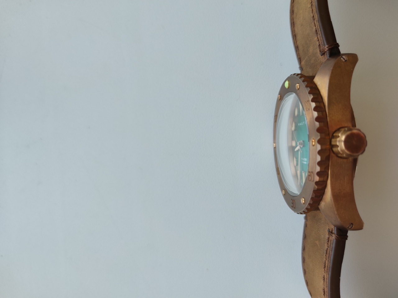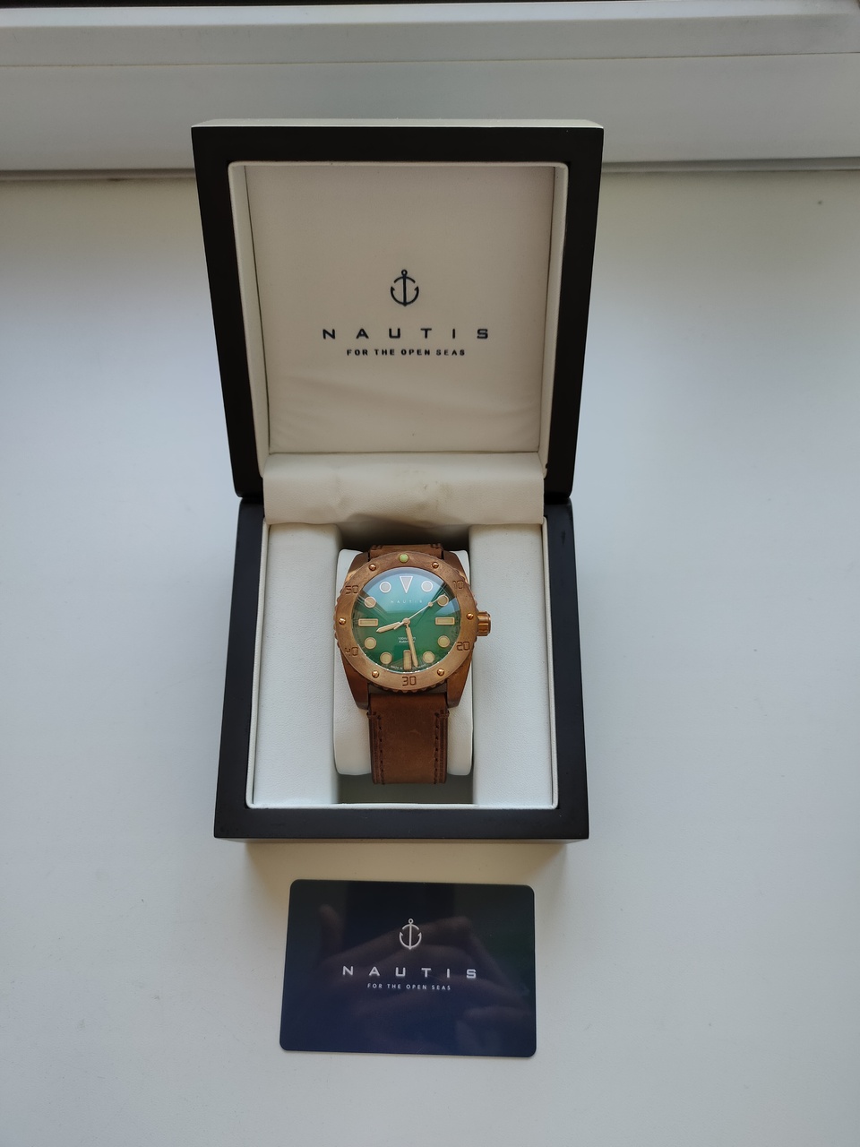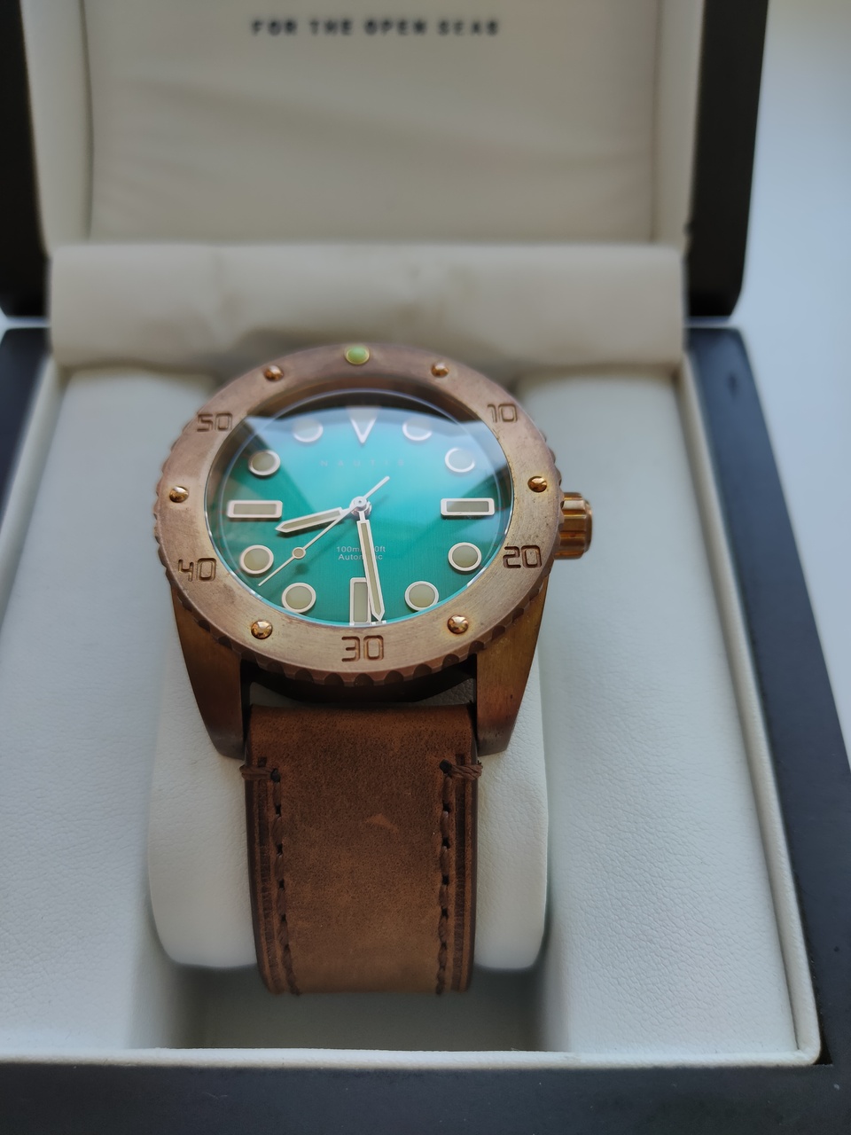 В продаже шикарная бронза из личной коллекции. Состоянии АА поставил с запасом. Считаю, что оно ближе к ААА. Под капотом надежный и проверенный временем NH35A от Seiko. Родной всего несколько раз одетый ремень очень крутого качества - толстый, мягкий, с отличной прострочкой и крупной бронзовой баклей. Несмотря на солидный размер, за счет коротких и правильно загнутых ушек, отлично садятся даже на запястье 17 см.