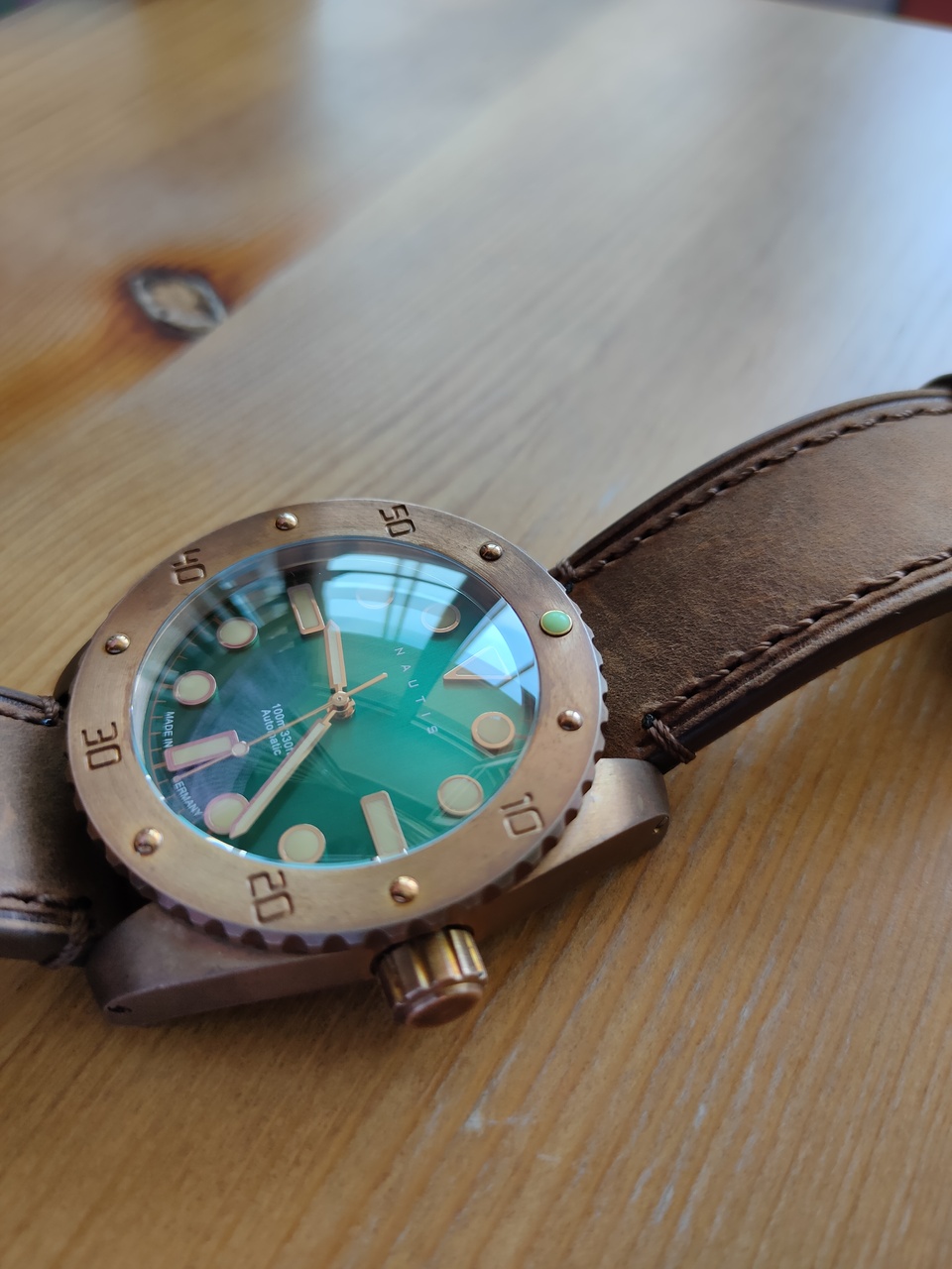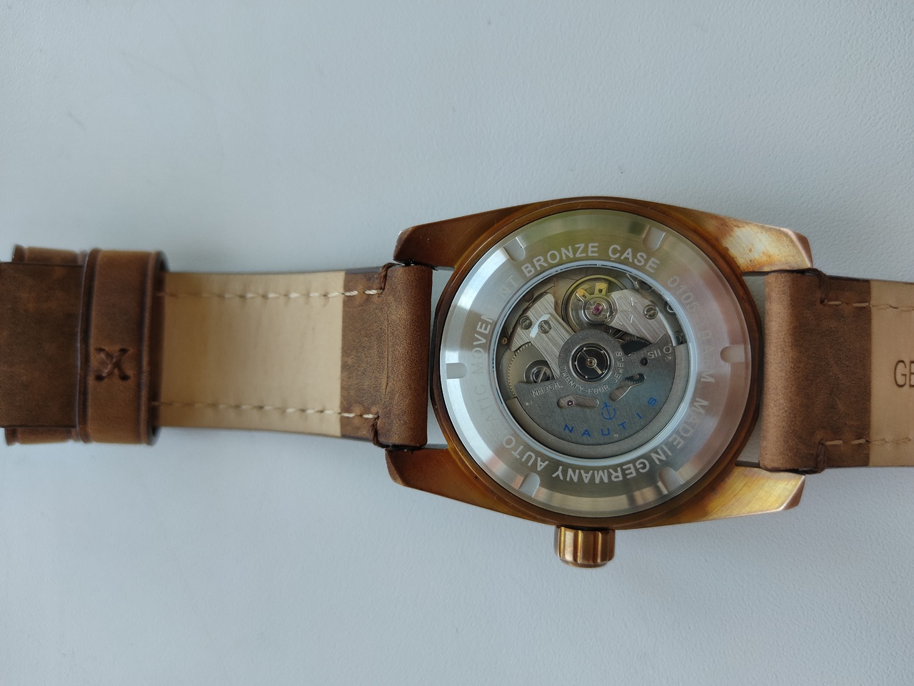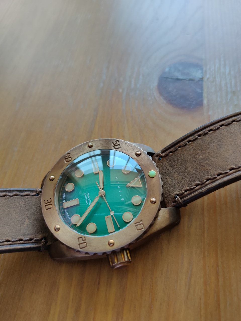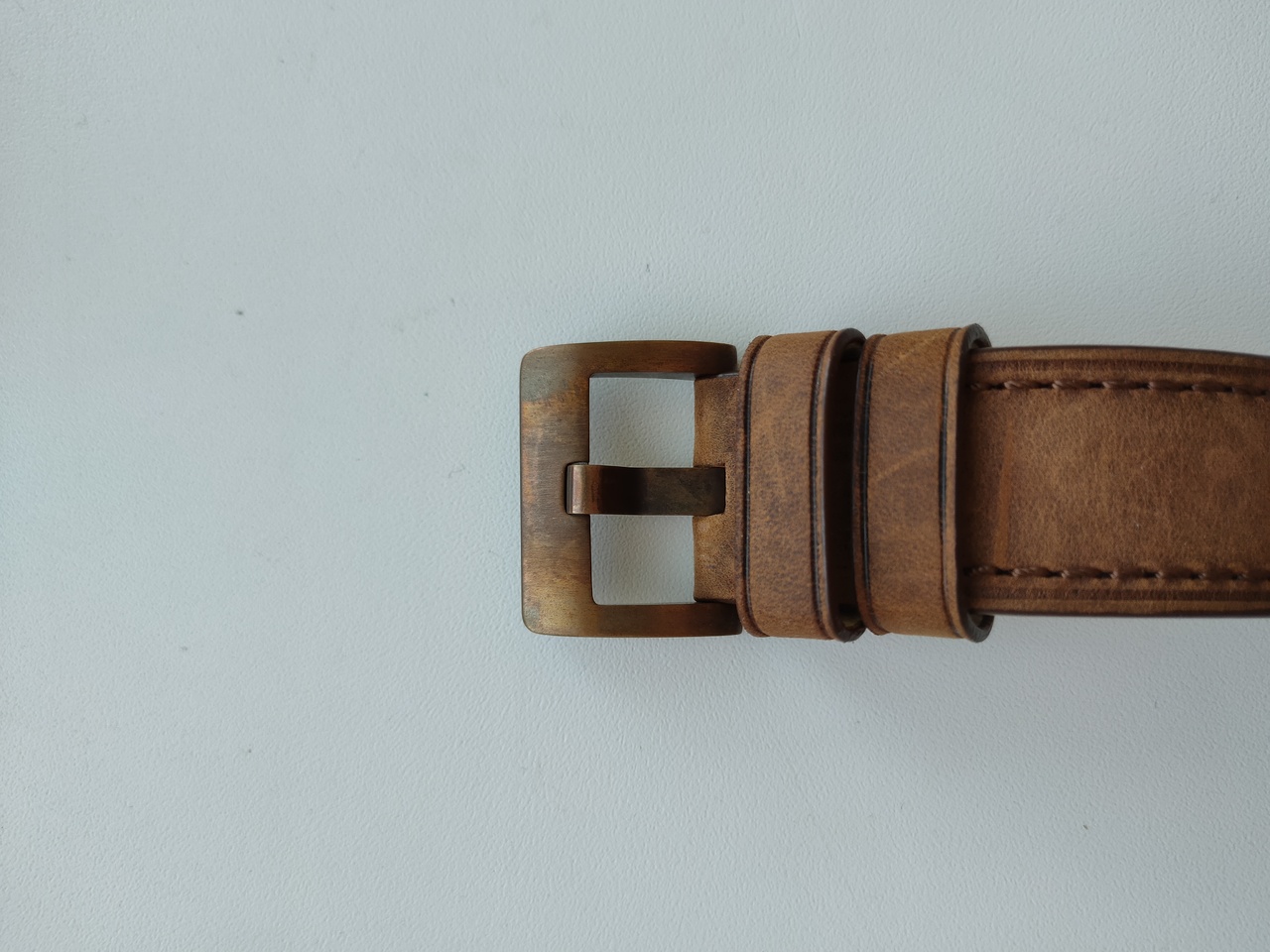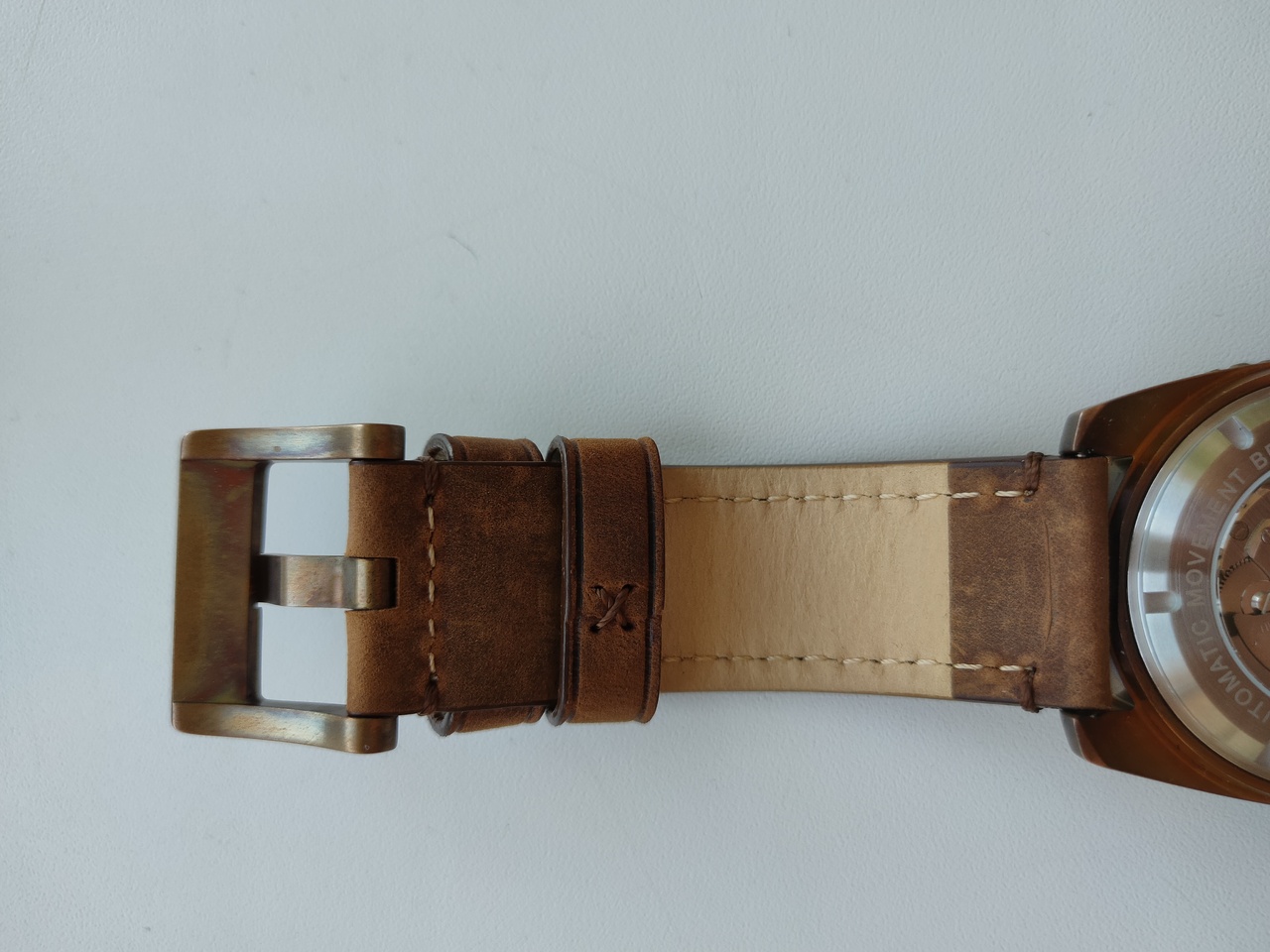 В продаже шикарная бронза из личной коллекции. Состоянии АА поставил с запасом. Считаю, что оно ближе к ААА. Под капотом надежный и проверенный временем NH35A от Seiko. Родной всего несколько раз одетый ремень очень крутого качества - толстый, мягкий, с отличной прострочкой и крупной бронзовой баклей. Несмотря на солидный размер, за счет коротких и правильно загнутых ушек, отлично садятся даже на запястье 17 см.
