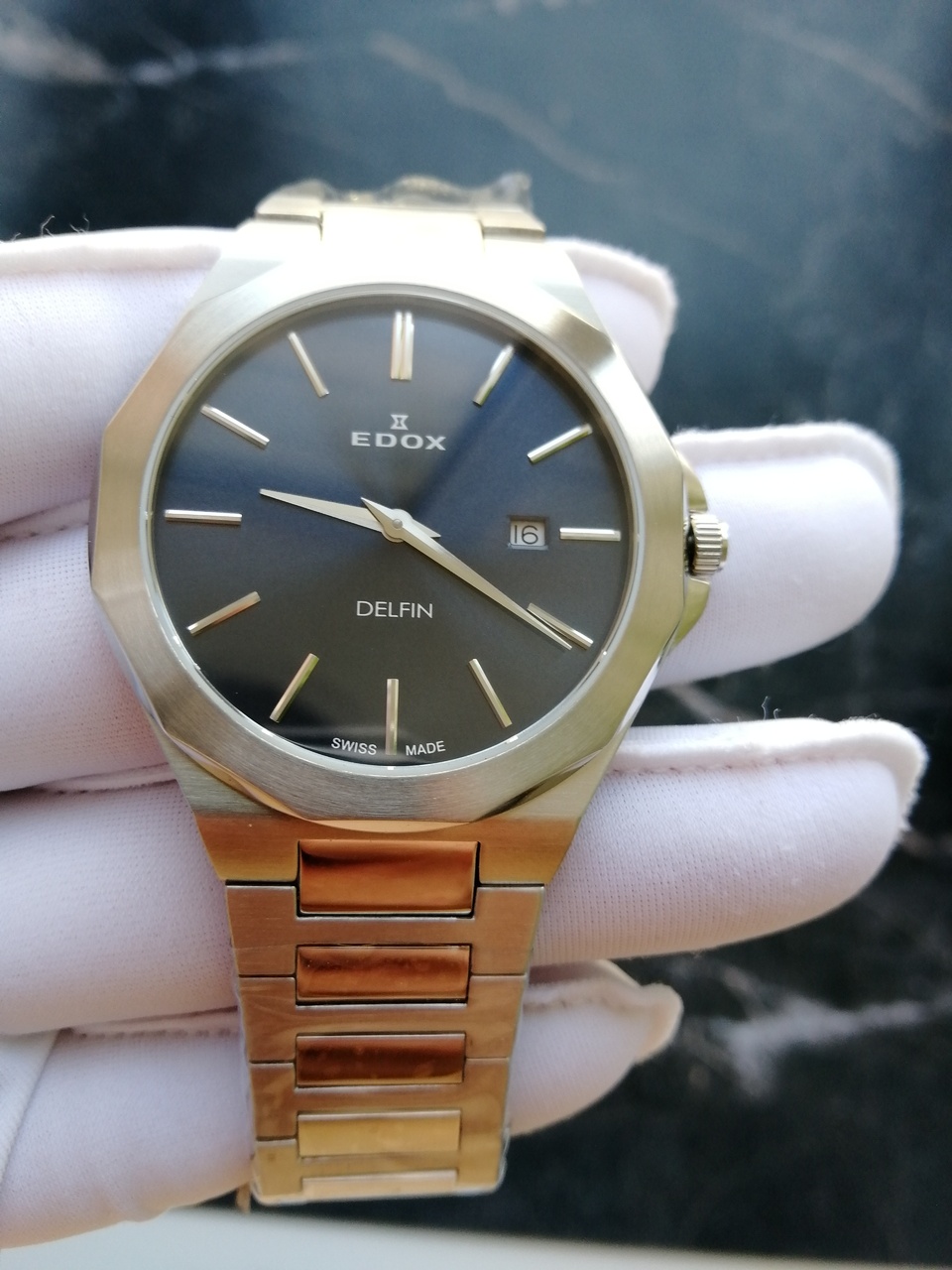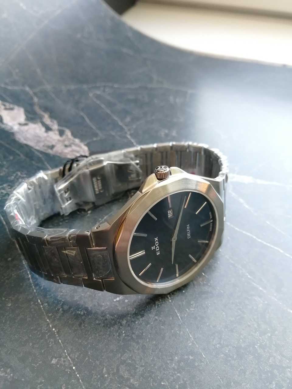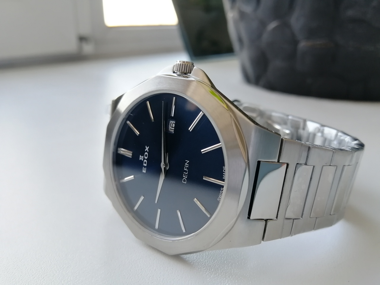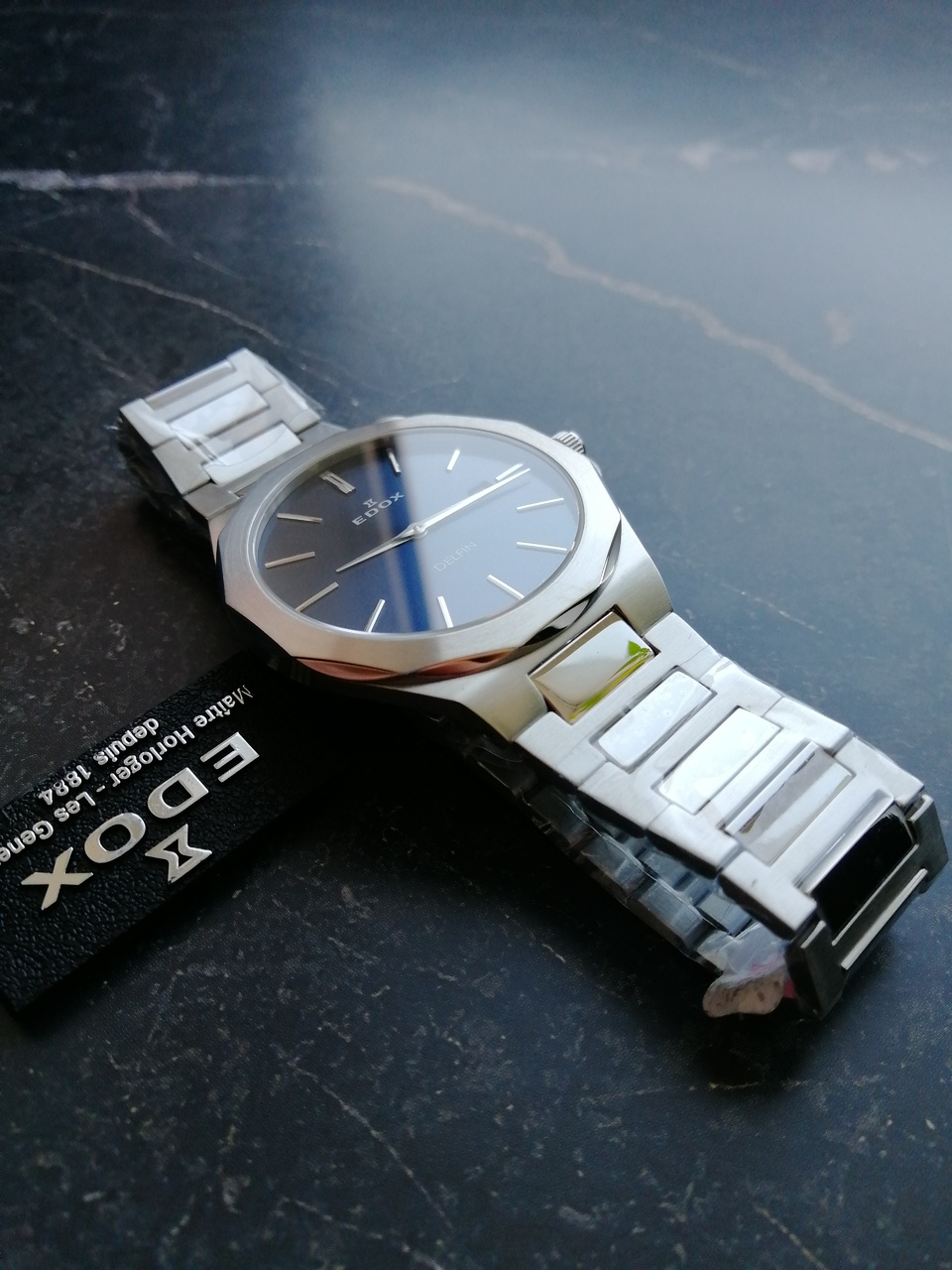 В продаже недавняя новинка от Edox. Замечательные легкие кварцевые часы с удобной посадкой. Запоминающийся, но, в то же время, строгий и лаконичный дизайн. Отличное качество отделки с сочетанием полировки и сатинирования, литой браслет. Глубокий насыщенный цвет цифера с эффектом sunburst, переливающийся от тёмно-синего до черного в зависимости от освещения, накладные метки. Вживую часы смотрятся очень солидно