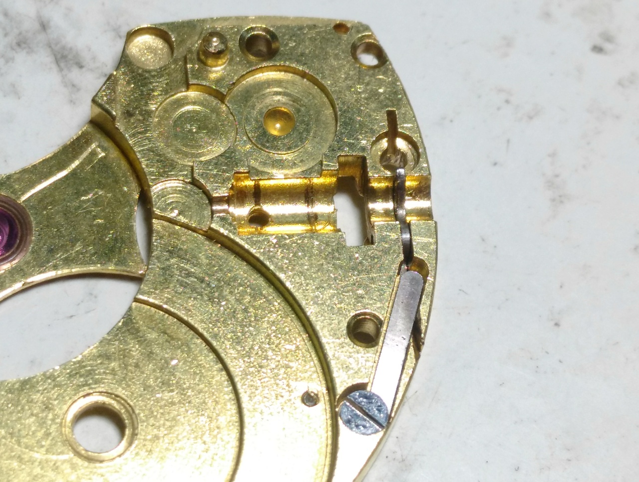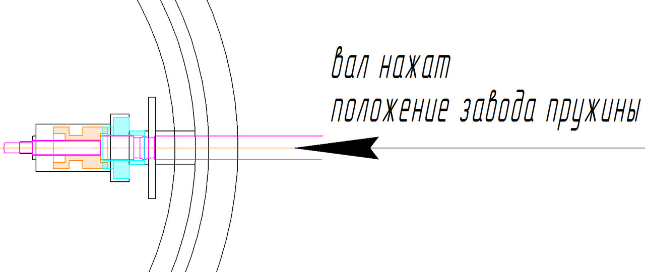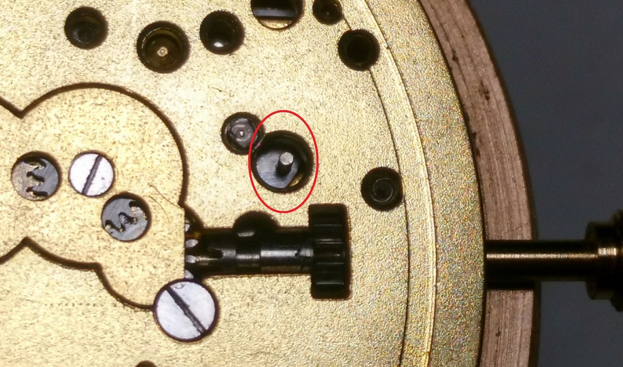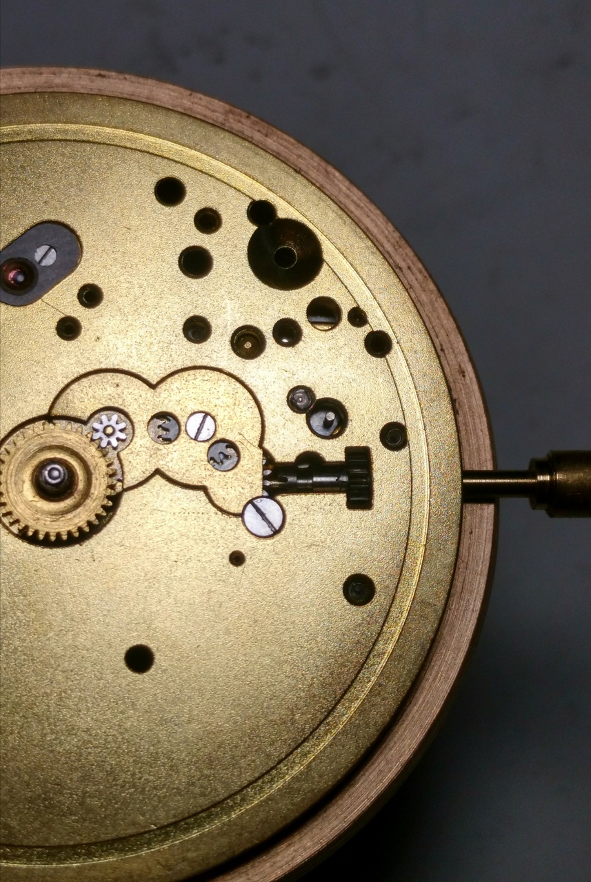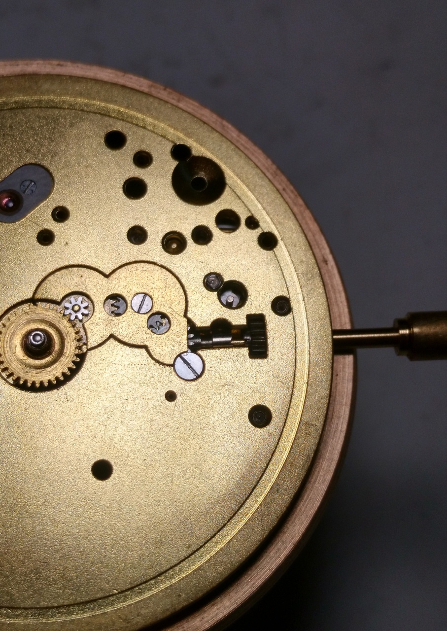 Вал в положении завода и перевода фиксируется подпружиненной пластиной, которая расположена на мосту барабана. Но мне кажется, что этого маловато и там есть ещё штифт в круглом отверстии, назначение которого я не понял. Может и он участвует в фиксации вала в разных положениях?