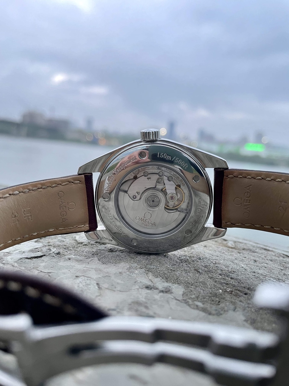 Восхитительный циферблат цвета серебра с отливом в Шампань в лучах заката весеннего солнца. Все это дополненно переливающимися накладными метками и фамильными стрелками. И довершает этот ансамбль шедеврального великолепия накладная подкова и гордое имя Omega в центре.