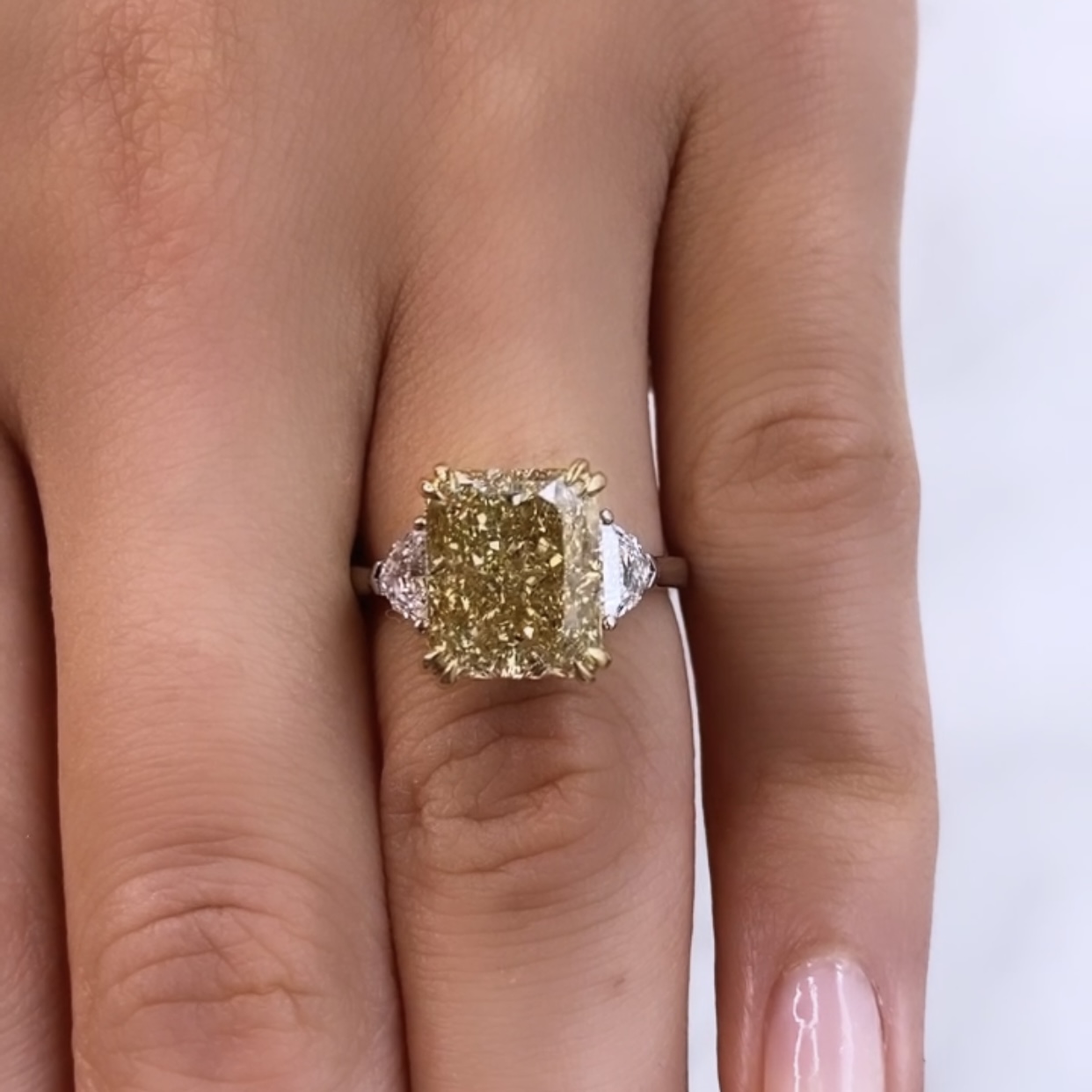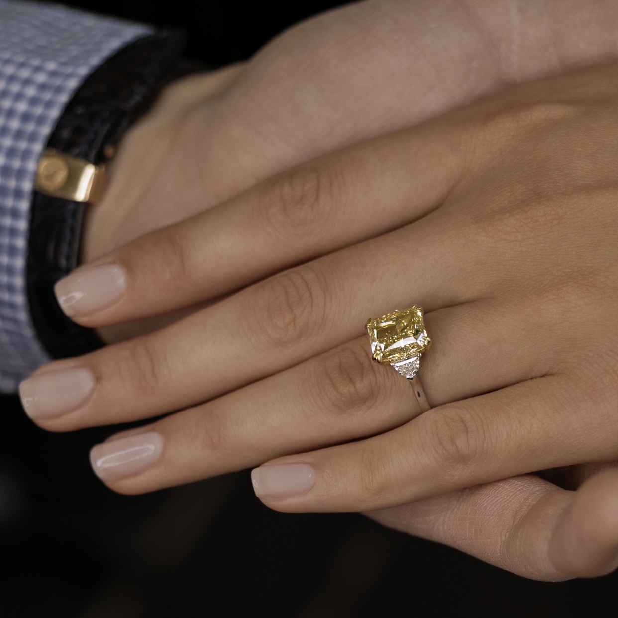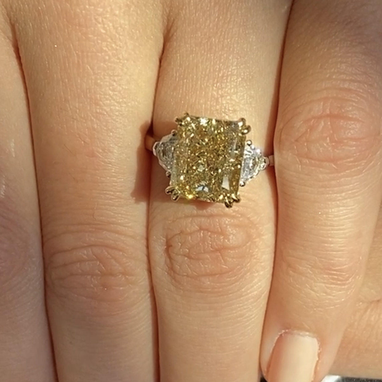 Кольцо с фантазийным желтым бриллиантом Fancy Yellow и белыми бриллиантами по бокам.